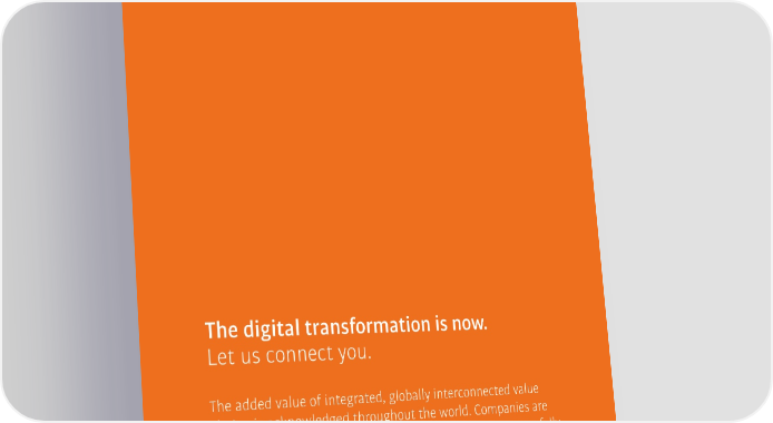 The digital transformation is now. Let us connect you. The added value of integrated, globally interconnected value chains is acknowledged throughout the world. Companies are opening up to the digital transformation in order to successfully compete in the markets of the future. As a thought leader and trailblazer for Industrie 4.0, 阀阀 supplies intelligent solutions for maximizing the 昀氀exibility of the entire process chain – from consultancy and conceptual design through to the complete implementation of individual requirements. With the expertise to help you step successfully into the future world of production, 阀阀 is transforming the here and now.