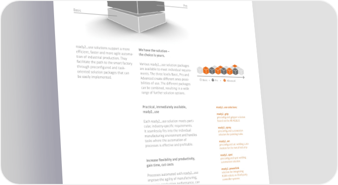 Powerful automation begins with “ready2�”. Advanced Pro Basic ready2�use solutions support a more We have the solution – efficient, faster and more agile automa- the choice is yours. tion of industrial production. They facilitate the path to the smart factory Various ready2�use solution packages through preconfigured and task- are available to meet individual require- oriented solution packages that can ments. The three levels Basic, Pro and be easily implemented. Advanced create different ones possi- Basic + Pro + Advanced bilities of use. The different packages can be combined, resulting in a wide range of further solution options. Practical, immediately available, ready2�use solutions: ready2�use ready2�grip precon昀椀gured gripper solution Each ready2�use solution meets parti- based on the KR AGILUS cular, industry-specific requirements. ready2�spray It seamlessly fits into the individual precon昀椀gured automation manufacturing environment and handles solution for painting tasks tasks where the automation of ready2�arc processes is effective and profitable. precon昀椀gured arc welding auto- mation for the metal industry Increase flexibility and productivity, ready2�spot precon昀椀gured spot welding gain time, cut costs automation solution Processes automated with ready2�use ready2�powerlink solution for integrating improve the agility of manufacturing, 阀阀 robots in third-party optimize production performance, can controller systems be quickly integrated into the existing ready2�pilot manufacturing environment and work solution package for the easy cost-effectively in precisely the areas control of a robot without a need where they quickly pay for themselves. for training ready2�fasten�micro complete automation solution for fastening of micro screws 84�85