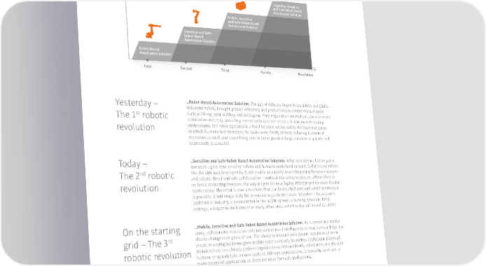 Four Robotic Revolutions �The disruptive force of robotics. Robotics have already changed the world. In the next 50 years, it will have a disruptive in昀氀uence similar to the one exerted by the internet and information technology over the past 昀椀ve decades. The societal change that will accompany this is re昀氀ected in the “four revolutions in automation technology”. Alongside industrial robotics, which will continue to grow strongly with new, networked manufacturing processes, the area of service robotics – and ultimately robots – will become more established in private settings. In addition to ever faster response and development times for new robot genera- tions, this step will also require a radically new approach. Innovation Cognitive, Sensitive and Safe Robot-Based Automation Solution Mobile, Sensitive and Safe Robot-Based Automation Solution Sensitive and Safe Robot-Based Automation Solution Robot-Based Automation Solution First Second Third Fourth Revolution Yesterday – �Robot-Based Automation Solution. The age of robotics began in the 1960s and 1970s. Industrial robots brought greater e昀昀iciency and productivity to simple manual tasks st such as lifting, spot welding and packaging. They began their triumphant advance in the The 1 robotic automotive industry, spreading successively to other sectors. In this manufacturing revolution environment, the robot operated in a 昀椀xed location within safety enclosures or zones to which humans had no access. Its tasks were clearly de昀椀ned: relieving humans of monotonous work and assembling cars or other goods in large volumes as quickly and as precisely as possible. Today – �Sensitive and Safe Robot-Based Automation Solution. What was science 昀椀ction just a few years ago is now a reality: robots and humans work hand in hand. Collaborative robots nd like the LBR iiwa developed by 阀阀 enable an entirely new relationship between humans The 2 robotic and robots: direct and safe collaboration – without any safety enclosure. Where there is revolution no fence restricting freedom, the way is open for new, highly e昀昀icient and far more 昀氀exible applications. The robot is now a machine that can be touched and with which interaction is possible. It will shape daily life in various ways in the future. Whether it be as a work assistant in industry, a service robot in the public sphere, a nursing robot in clinical settings, a helper in the home or in many other areas which today still sound futuristic. On the starting �Mobile, Sensitive and Safe Robot-Based Automation Solution. As autonomous mobile units, collaborative robots are able not only to react intelligently to their surroundings, but rd also to change their place of use. The ability to interact with people, machines or work- grid – The 3 pieces in varying locations gives mobile robots virtually boundless application potential. robotic revolution Mobile robots can already perform logistics tasks independently, collaborate directly with humans or quickly take on new tasks at di昀昀erent workstations. Essentially, there are as many potential applications as there are ideas for such applications. In the future – �Cognitive, sensitive and safe robot-based automation solution. If the robots of the future are characterized by arti昀椀cial intelligence, they will re昀氀ect on and cognitively The 4th robotic understand what they do. They will increase the productivity of humans to a much greater extent than today, while the interactions between humans and robots will become ever revolution simpler. They will have the ability to interpret human language and gestures (smartphone voice recognition systems are already a 昀椀rst step in this direction). On this level, robots will 昀椀nally become active companions for humans. The “thinking” maid, Rosie, from the science 昀椀ction cartoon “The Jetsons” or Lieutenant Commander Data from “Star Trek” will indeed remain 昀椀ction for a long time, but in terms of their capabilities robots will come ever closer to these imagined characters. Hello Industrie 4.0�Glossary