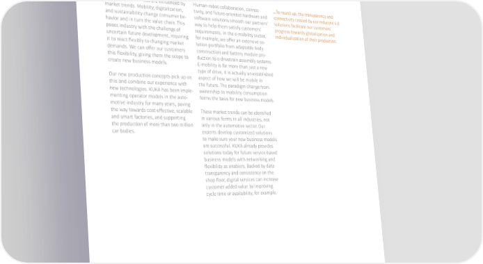 Industry and business, characterized by market trends New challenges between consumer behavior and business models Industry and business are in昀氀uenced by Human-robot collaboration, connec- �To round up, the transparency and market trends. Mobility, digitalization, tivity, and future-oriented hardware and connectivity created by our Industrie 4.0 and sustainability change consumer be- software solutions smooth our partners’ solutions facilitate our customers’ havior and in turn the value chain. This way to help them satisfy customers’ progress towards globalization and poses industry with the challenge of requirements. In the e-mobility sector, individualization of their production. uncertain future development, requiring for example, we o昀昀er an extensive so- it to react 昀氀exibly to changing market lution portfolio from adaptable body demands. We can o昀昀er our customers construction and battery module pro- this 昀氀exibility, giving them the scope to duction to e-drivetrain assembly systems. create new business models. E-mobility is far more than just a new type of drive, it is actually an established Our new production concepts pick up on aspect of how we will be mobile in this and combine our experience with the future. The paradigm change from new technologies. 阀阀 has been imple- ownership to mobility consumption menting operator models in the auto- forms the basis for new business models. motive industry for many years, paving the way towards cost-e昀昀ective, scalable These market trends can be identi昀椀ed and smart factories, and supporting in various forms in all industries, not the production of more than two million only in the automotive sector. Our car bodies. experts develop customized solutions to make sure your new business models are successful. 阀阀 already provides solutions today for future service-based business models with networking and 昀氀exibility as enablers. Backed by data transparency and consistency on the shop 昀氀oor, digital services can increase customer added value by improving cycle time or availability, for example. Hello Industrie 4.0�we connect you