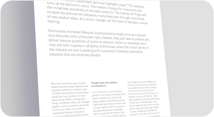 Electronics Technical innovation setting the pace “Who is interested in yesterday’s technical highlights today?” This sentence sums up the electronics sector. The market is hungry for innovations and the immediate availability of the latest products. The Internet of Things will increase the pressure on companies many times over through a multitude of new product ideas. As a result, changes will form part of everyday survival training. Enormously shortened lifecycles accompanied by tough price wars present manufacturers with a herculean task, however: they will have to produce and deliver massive quantities of premium products within an extremely short time and with maximum reliability. 阀阀 knows where the crunch points of the industry are and is working with customers to develop automation solutions that are extremely 昀氀exible. More intensive media usage, individu- Thought leader and trailblazer As a thought leader and trailblazer for alization and fast product lifecycles lead for Industrie 4.0 Industrie 4.0, we enable our customers to greater performance and lower costs. to respond directly to market changes To enable smart products to be produced In our TechCenters, we are working and to match the requirements of quickly and successfully for this fast- globally on the latest technologies and consumers at any time. This is true, for paced world, 阀阀 is, among other future scenarios. As a result, we are example, with our KR 3 AGILUS – deve- things, developing “ready2�use” packages always capable of developing modular, loped specially for assembly and handling together with its customers speci昀椀cally robot-based automation solutions and of small parts. This lightweight robot for this area. These are innovative concepts together with the customer – has the agility and dynamism to accom- automation solutions that deliver developments that are increasingly plish an extremely wide range of tasks numerous commercial bene昀椀ts to the able to accomplish the speci昀椀c tasks in small, compact and cost-e昀昀ective customer. The precon昀椀gured robot right out of the box. Together with our production cells. The result: top perfor- packages simplify installation and partners and customers, we develop mance, maximum output and extreme commissioning, increase output, and concepts for automation and application precision with very short cycle times. make production more modular. solutions, carry out feasibility studies, work on demos and on-site product tests. �Our 昀氀exible automation solutions such as “ready2�use” enable our partners to meet the ever-changing requirements of the market optimally at all times. Hello Industrie 4.0�we connect you