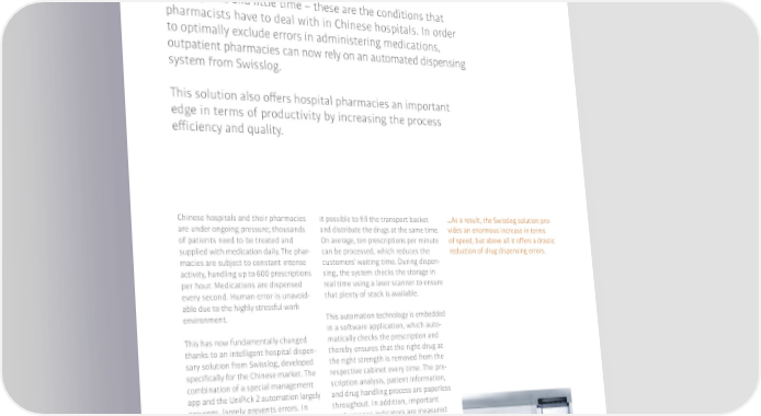 Automated dispensary for Chinese clinics Robotics as a remedy for stressed pharmacists Tight spaces and little time – these are the conditions that pharmacists have to deal with in Chinese hospitals. In order to optimally exclude errors in administering medications, outpatient pharmacies can now rely on an automated dispensing system from Swisslog. This solution also o昀昀ers hospital pharmacies an important edge in terms of productivity by increasing the process e昀昀iciency and quality. Chinese hospitals and their pharmacies it possible to fill the transport basket �As a result, the Swisslog solution pro- are under ongoing pressure; thousands and distribute the drugs at the same time. vides an enormous increase in terms of patients need to be treated and On average, ten prescriptions per minute of speed, but above all it offers a drastic supplied with medication daily. The phar- can be processed, which reduces the reduction of drug dispensing errors. macies are subject to constant intense customers' waiting time. During dispen- activity, handling up to 600 prescriptions sing, the system checks the storage in per hour. Medications are dispensed real time using a laser scanner to ensure every second. Human error is unavoid- that plenty of stock is available. able due to the highly stressful work environment. This automation technology is embedded in a software application, which auto- This has now fundamentally changed matically checks the prescription and thanks to an intelligent hospital dispen- thereby ensures that the right drug at sary solution from Swisslog, developed the right strength is removed from the specifically for the Chinese market. The respective cabinet every time. The pre- combination of a special management scription analysis, patient information, app and the UniPick 2 automation largely and drug handling process are paperless prevents. largely prevents errors. In throughout. In addition, important addition, the manual process of drug performance indicators are measured and prescription management is digitized, and presented in real time on a KPI increasing the hospitals’ productivity. (key performance indicator) dashboard. Information about prescription category, UniPick 2 consists of a conveyor that dispensing status, inventories etc. moves vertically up and down on the stor- can be compiled in a graphical report age racks as well as a robotic loading and archived. This enables continuous module, the combination of which makes digitized inventory management. 80�81