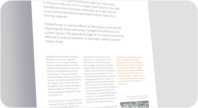 Automated software upgrades Fountain of youth for warehouse management software Digital solutions require continuous updating. Particularly in the era of Industrie 4.0 it is of great importance for the imple- mented solutions to be kept continually up to date and not cause performance bottlenecks due to inconsistencies or missing upgrades. ForeverYoung is a service o昀昀ered by Swisslog for automatically migrating the SynQ warehouse management solution to the current version. The great advantages of this service are proving e昀昀ective in practical operation at Norwegian trading company Harlem Food. Alongside product quality, speed and solution to the most recent version �This service reduces downtime and flexibility are the most important every year so as to be able to use the errors resulting from incomplete demands to be met by food retailers. latest features of the platform and upgrades. As even minor updates are Modern trading companies can hardly also to support appropriately certified implemented promptly, the company satisfy these demands in the long term solutions from third-party vendors. As also avoids more extensive upgrade without sound digitization solutions. experience has shown that compatibility procedures. ForeverYoung really keeps Major players in this sector therefore problems may repeatedly arise in the SynQ continuously up to date with implement high-performance warehouse interaction between hardware, databases the latest releases – a key element in systems. The Scandinavian Harlem Group, and operating systems on account of a smart warehousing solution and the for example, relies on the warehouse upgrades not being promptly implemen- basis for further future Industrie 4.0 management and business intelligence ted, the Harlem Group opted to make applications. platform SynQ from Swisslog, which use of a Swisslog service that is becoming makes warehouse management ready ever more important for Industrie 4.0 for Industrie 4.0. environments: the ForeverYoung migration service. This is an optional feature of The Harlem Group is a fully integrated Swisslog support and automates admin- Swisslog’s upgrades allow access to new trading company specialized in buying istration of the SynQ environment. features such as 3D visualizations. and selling consumer goods on an international scale. The company offers The ForeverYoung process begins by com- products and services for the retail paring the productive version of SynQ market and food industry with a port- deployed by the Harlem Group with the folio including commodities, consumer youngest platform version available at goods and private label products. It the time. An upgrade version of the markets an assortment of more than Harlem Group solution, adapted to any 800 products and makes annual trades new features introduced in the mean- of over 300,000 tonnes of commodities. time, is then automatically tested and As a user of SynQ software, the Harlem validated before being migrated to the Group has the option to migrate the active work environment. 76�77