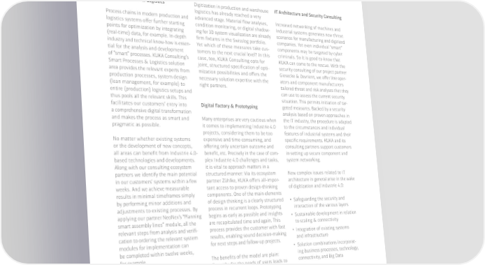 Smart Processes & Logistics Digitization in production and warehouse IT Architecture and Security Consulting logistics has already reached a very Process chains in modern production and advanced stage. Material 昀氀ow analyses, Increased networking of machines and logistics systems o昀昀er further starting condition monitoring, or digital shadow- industrial systems generates new threat points for optimization by integrating ing for 3D system visualization are already scenarios for manufacturing and digitized (real-time) data, for example. In-depth 昀椀rm 昀椀xtures in the Swisslog portfolio. companies. Yet even individual “smart” industry and technical know-how is essen- Yet which of these measures take cus- components may be targeted by cyber tial for the analysis and development tomers to the next crucial level? In this criminals. So it is good to know that of “smart” processes. 阀阀 Consulting’s case, too, 阀阀 Consulting opts for 阀阀 can come to the rescue. With the Smart Processes & Logistics solution joint, structured speci昀椀cation of opti- security consulting of our project partner area provides the relevant experts from mization possibilities and o昀昀ers the Giesecke & Devrient, we o昀昀er line oper- production processes, system design necessary solution expertise with the ators and component manufacturers (lean management, for example) to right partners. tailored threat and risk analyses that they entire (production) logistics setups and can use to assess the current security thus pools all the relevant skills. This situation. This permits initiation of tar- facilitates our customers’ entry into Digital Factory & Prototyping geted measures. Backed by a security a comprehensive digital transformation analysis based on proven approaches in and makes the process as smart and Many enterprises are very cautious when the IT industry, the procedure is adapted pragmatic as possible. it comes to implementing Industrie 4.0 to the circumstances and individual projects, considering them to be too features of industrial systems and their No matter whether existing systems expensive and time-consuming, and speci昀椀c requirements. 阀阀 and its or the development of new concepts, o昀昀ering only uncertain outcome and consulting partners support customers all areas can bene昀椀t from Industrie 4.0- bene昀椀t, etc. Precisely in the case of com- in setting up secure component and based technologies and developments. plex Industrie 4.0 challenges and tasks, system networking. Along with our consulting ecosystem it is vital to approach matters in a partners we identify the main potential structured manner: Via its ecosystem New complex issues related to IT in our customers’ systems within a few partner Zühlke, 阀阀 o昀昀ers all-impor- architecture in general arise in the wake weeks. And we achieve measurable tant access to proven design-thinking of digitization and Industrie 4.0: results in minimal timeframes simply components. One of the main elements by performing minor additions and of design thinking is a clearly structured • Safeguarding the security and adjustments to existing processes. By process in recurrent loops. Prototyping interaction of the various layers applying our partner NeoNex’s “Planning begins as early as possible and insights • Sustainable development in relation smart assembly lines” module, all the are recapitulated time and again. This to scaling & connectivity relevant steps from analysis and veri昀椀- process provides the customer with fast • Integration of existing systems cation to ordering the relevant system results, enabling sound decision-making and infrastructure modules for implementation can for next steps and follow-up projects. be completed within twelve weeks, • Solution combinations incorporat- for example. The bene昀椀ts of the model are plain: ing business processes, technology, Empathy for the needs of users leads to connectivity, and Big Data the development of solutions that are actually needed. Thanks to fast, e昀昀icient Here too, 阀阀 o昀昀ers the right advice prototyping, we do not beat about the on these issues and devises integrated bush, but try things out as quickly as solutions together with customers. possible, together with a cross-disci- plinary team. Any mistakes are made together to learn from them – all of this taking place within a set budget. This is the fastest route to innovation. Hello Industrie 4.0�we connect you