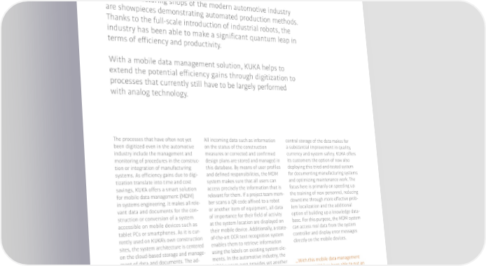 Smartphone instead of clipboard Mobile data management in the automotive industry The manufacturing shops of the modern automotive industry are showpieces demonstrating automated production methods. Thanks to the full-scale introduction of industrial robots, the industry has been able to make a signi昀椀cant quantum leap in terms of e昀昀iciency and productivity. With a mobile data management solution, 阀阀 helps to extend the potential e昀昀iciency gains through digitization to processes that currently still have to be largely performed with analog technology. The processes that have often not yet All incoming data such as information central storage of the data makes for been digitized even in the automotive on the status of the construction a substantial improvement in quality, industry include the management and measures or corrected and confirmed currency and system safety. KUKA offers monitoring of procedures in the construc- design plans are stored and managed in its customers the option of now also tion or integration of manufacturing this database. By means of user profiles deploying this tried-and-tested system systems. As efficiency gains due to digi- and defined responsibilities, the MDM for documenting manufacturing systems tization translate into time and cost system makes sure that all users can and optimizing maintenance work. The savings, KUKA offers a smart solution access precisely the information that is focus here is primarily on speeding up for mobile data management (MDM) relevant for them. If a project team mem- the training of new personnel, reducing in systems engineering. It makes all rele- ber scans a QR code affixed to a robot downtime through more effective prob- vant data and documents for the con- or another item of equipment, all data lem localization and the additional struction or conversion of a system of importance for their field of activity option of building up a knowledge data- accessible on mobile devices such as at the system location are displayed on base. For this purpose, the MDM system tablet PCs or smartphones. As it is cur- their mobile device. Additionally, a state- can access real data from the system rently used on KUKA’s own construction of-the-art OCR text recognition system controller and display error messages sites, the system architecture is centered enables them to retrieve information directly on the mobile devices. on the cloud-based storage and manage- using the labels on existing system ele- ment of data and documents. The ad- ments. In the automotive industry, the vantages of this solution are obvious: MDM system even provides yet another �With this mobile data management mechanics, electricians or project option for increasing process efficiency: solution, KUKA has been able to put an managers can download all required as all relevant data are collected cen- end to the analog age at a central node information from the central database trally, the time is saved that the per- of the value chain – a further, important using any compatible mobile device, sonnel previously needed to search for step towards the Industrie 4.0 pro- allowing them to work offline as well. the appropriate documents. Moreover, duction environment. Hello Industrie 4.0�we connect you