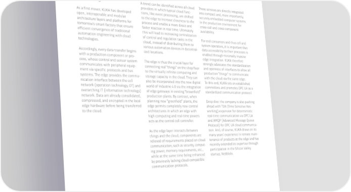 阀阀 Digital Domains Technical concept Shop floor / edge A trend can be identified across all cloud These services are directly integrated providers in which typical cloud func- into compact and, more importantly, As a first mover, KUKA has developed tions, like event processing, are shifted securely embedded computer systems open, interoperable and modular to the edge to increase closeness to the in the production environment for architecture layers and platforms for process and enable a more direct and cross-cell and cross-component tomorrow’s smart factory that ensure faster reaction in real time. Ultimately availability. efficient convergence of traditional this will lead to increasing centralization automation engineering with cloud of control and regulation tasks in the For end consumers and thus cell and technologies. cloud, instead of distributing them to system operators, it is important that various automation devices in decentral- data accessibility to their processes is Accordingly, every data transfer begins ized locations. enabled through minimally invasive with a production component or pro- edge integration. KUKA therefore cess, whose control and sensor system The edge is thus the crucial layer for strongly advocates the standardization communicates with peripheral equip- connecting real “things” on the shop floor and openness of interfaces to allow all ment via specific protocols and bus to the virtually infinite computing and production “things” to communicate systems. The edge provides the commu- storage capacity in the cloud. They can with the cloud via the same edge. nication interface between the cell also be incorporated into the new digital To this end, KUKA sits on established network (operation technology, OT) and world of Industrie 4.0 via the integration committees and promotes OPC UA as a overarching IT (information technology) of edge gateways in existing “brownfield” standardized communication protocol. network. Data are already consolidated, production plants. By contrast, when compressed, and encrypted in the local planning new “greenfield” plants, the Deep dive: the company is also pushing edge hardware before being transferred edge permits completely new control ahead with TSN (Time Sensitive Net- to the cloud. architectures in which an edge with working) expansion for deterministic high computing and real-time powers real-time communication via OPC UA acts as the central cell controller. and AMQP (Advanced Message Queue Protocol) for OPC UA cloud communica- As the edge layer interacts between tion. And, of course, KUKA draws on its things and the cloud, components are many years’ experience in remote main- relieved of requirements placed on cloud tenance of products at the edge and has communication, such as security, comput- recently extended its expertise through ing power, memory requirements, etc., participation in the Silicon Valley while at the same time being enhanced startup, Nebbiolo. by previously lacking cloud-compatible communication protocols. Hello Industrie 4.0�we connect you