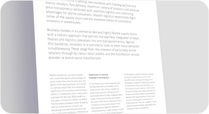 E-Commerce / Retail Smart automation of unpredictable processes Electronic commerce is setting new standards and challenging brick-and- mortar retailers. Fast delivery, maximum variety of products and absolute price transparency combined with seamless logistics are convincing advantages for online consumers. Smooth logistics necessitates digiti- zation of the supply chain and the implementation of automation solutions in warehouses. Business models in e-commerce demand highly 昀氀exible supply chains with a holistic approach that permits the seamless integration of retail, 昀椀nance and logistics processes into one transparent entity. Against this backdrop, solutions in e-commerce have to meet many demands simultaneously. These range from the interests of exclusively online retailers through to classic retail outlets and the distribution service provider or brand-name manufacturer. Mobile end devices, internet research Digitization is creating on the goods-to-person principle. Human- with a purchase option and exchange via intelligent intralogistics machine collaborations such as the social media have now become part and AutoPiQ order picking technology from parcel of the buying process. As a result, In the future ever more powerful fore- Swisslog are capable of opening up areas it is almost certain that the commercial casting tools will be available to the to automation that were previously an signi昀椀cance of e-commerce will increase retail sector that will be capable of exclusively manual domain. Particularly further in coming years. Even conservative predicting consumer behavior more forward-looking: even today Swisslog can estimates for the year 2020 predict on- accurately and will allow targeted adver- already seamlessly depict the transitions line sales in excess of 4 trillion US dollars. tising. Smart purchasing may require between the requirements in brick-and- The boundaries between online shopping only two clicks by the consumer, but it mortar retailing and e-commerce in and brick-and-mortar retailers are is based on extremely complex and hybrid systems. They are capable of both becoming more blurred and entering heterogeneous logistics networks – order picking for pallets and single-item into a long-term symbiosis. Whereas we characterized by a large number of data shipments from a warehouse. are currently still busy mapping the interfaces and an interchange between intermeshing of internal and external automated and manual activities, for logistics processes in real time, the trend example in the storage and picking of is moving towards predictive analytics goods. The latest automation technol- of the available mass of data. This means ogies from Swisslog are already provi- that we are using digital information ding the e-commerce and retail sectors �Industrie 4.0 solutions from 阀阀 intelligently enough to allow the next with networked software and robot- optimize the throughput of goods, consumer action to be predicted based logistics concepts that precisely minimize downtime and ensure both accurately. serve the nerve centers of the logistics transparency and high-speed responses chain – for instance, technologies based throughout the entire supply chain. 22�23