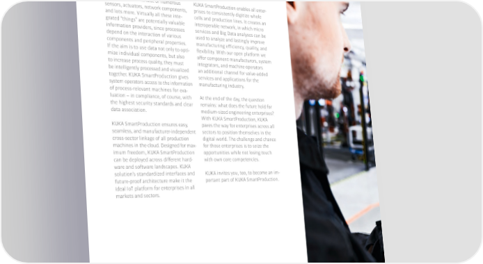 KUKA SmartProduction For seamless transparency across all processes Production lines consist of numerous KUKA SmartProduction enables all enter- sensors, actuators, network components, prises to consistently digitize whole and lots more. Virtually all these inte- cells and production lines. It creates an grated “things” are potentially valuable interoperable network, in which micro information providers, since processes services and Big Data analyses can be depend on the interaction of various used to analyze and lastingly improve components and peripheral properties. manufacturing efficiency, quality, and If the aim is to use data not only to opti- flexibility. With our open platform we mize individual components, but also offer component manufacturers, system to increase process quality, they must integrators, and machine operators be intelligently processed and visualized an additional channel for value-added together. KUKA SmartProduction gives services and applications for the system operators access to the information manufacturing industry. of process-relevant machines for eva- luation – in compliance, of course, with At the end of the day, the question the highest security standards and clear remains: what does the future hold for data association. medium-sized engineering enterprises? With KUKA SmartProduction, KUKA KUKA SmartProduction ensures easy, paves the way for enterprises across all seamless, and manufacturer-independent sectors to position themselves in the cross-sector linkage of all production digital world. The challenge and chance machines in the cloud. Designed for max- for those enterprises is to seize the imum freedom, KUKA SmartProduction opportunities while not losing touch can be deployed across different hard- with own core competencies. ware and software landscapes. KUKA solution’s standardized interfaces and KUKA invites you, too, to become an im- future-proof architecture make it the portant part of KUKA SmartProduction. ideal IoT platform for enterprises in all markets and sectors. Hello Industrie 4.0�we connect you