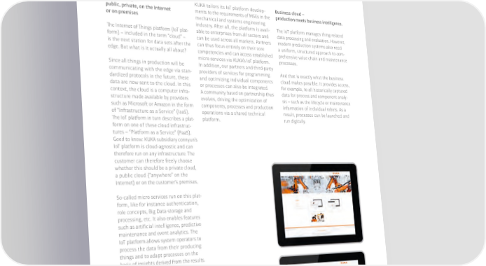 The cloud layer – KUKA tailors its IoT platform develop- Business cloud – public, private, on the Internet ments to the requirements of MSEs in the production meets business intelligence. or on premises mechanical and systems engineering industry. After all, the platform is avail- The IoT platform manages thing-related The Internet of Things platform (IoT plat- able to enterprises from all sectors and data processing and evaluation. However, form) – included in the term “cloud” – can be used across all markets. Partners modern production systems also need is the next station for data sets after the can thus focus entirely on their core a uniform, structured approach to com- edge. But what is it actually all about? competencies and can access established prehensive value chain and maintenance micro services via KUKA’s IoT platform. processes. Since all things in production will be In addition, our partners and third-party communicating with the edge via stan- providers of services for programming And that is exactly what the business dardized protocols in the future, these and optimizing individual components cloud makes possible. It provides access, data are now sent to the cloud. In this or processes can also be integrated. for example, to all historically captured context, the cloud is a computer infra- A community based on partnership thus data for process and component analy- structure made available by providers evolves, driving the optimization of sis – such as the lifecycle or maintenance such as Microsoft or Amazon in the form components, processes and production information of individual robots. As a of “Infrastructure as a Service” (IaaS). operations via a shared technical result, processes can be launched and The IoT platform in turn describes a plat- platform. run digitally. form on one of these cloud infrastruc- tures – “Platform as a Service” (PaaS). Good to know: KUKA subsidiary connyun’s IoT platform is cloud-agnostic and can therefore run on any infrastructure. The customer can therefore freely choose whether this should be a private cloud, a public cloud (“anywhere” on the Internet) or on the customer’s premises. So-called micro services run on this plat- form, like for instance authentication, role concepts, Big Data storage and processing, etc. It also enables features such as artificial intelligence, predictive maintenance and event analytics. The IoT platform allows system operators to process the data from their producing things and to adapt processes on the basis of insights derived from the results. Hello Industrie 4.0�we connect you