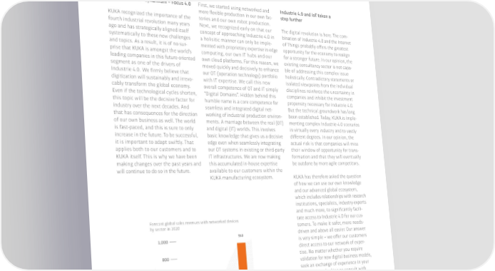 Holistic. Intelligent. Interconnected. Programmed for dynamism – Focus 4.0 First, we started using networked and Industrie 4.0 and IoT taken a more 昀氀exible production in our own fac- step further 阀阀 recognized the importance of the tories and our own robot production. fourth industrial revolution many years Next, we recognized early on that our The digital revolution is here. The com- ago and has strategically aligned itself concept of approaching Industrie 4.0 in bination of Industrie 4.0 and the Internet systematically to these new challenges a holisitic manner can only be imple- of Things probably o昀昀ers the greatest and topics. As a result, it is of no sur- mented with proprietary expertise in edge opportunity for the economy to realign prise that 阀阀 is amongst the world’s computing, our own IT hubs and our for a stronger future. In our opinion, the leading companies in this future-oriented own cloud platforms. For this reason, we existing consultancy sector is not capa- segment as one of the drivers of moved quickly and decisively to enhance ble of addressing this complex issue Industrie 4.0. We 昀椀rmly believe that our OT (operation technology) portfolio holistically. Contradictory statements or digitization will sustainably and irrevo- with IT expertise. We call this new isolated viewpoints from the individual cably transform the global economy. overall competence of OT and IT simply disciplines reinforce the uncertainty in Even if the technological cycles shorten, “Digital Domains”. Hidden behind this companies and inhibit the investment this topic will be the decisive factor for humble name is a core competence for propensity necessary for Industrie 4.0. industry over the next decades. And seamless and integrated digital net- But the technical groundwork has long that has consequences for the direction working of industrial production environ- been established. Today, 阀阀 is imple- of our own business as well. The world ments. A marriage between the real (OT) menting complex Industrie 4.0 scenarios is fast-paced, and this is sure to only and digital (IT) worlds. This involves in virtually every industry and to vastly increase in the future. To be successful, basic knowledge that gives us a decisive di昀昀erent degrees. In our opinion, the it is important to adapt swiftly. That edge even when seamlessly integrating actual risk is that companies will miss applies both to our customers and to our OT systems in existing or third-party their window of opportunity for trans- 阀阀 itself. This is why we have been IT infrastructures. We are now making formation and that they will eventually making changes over the past years and this accumulated in-house expertise be outdone by more agile competitors. will continue to do so in the future. available to our customers within the 阀阀 manufacturing ecosystem. 阀阀 has therefore asked the question of how we can use our own knowledge and our advanced global ecosystem, which includes relationships with research institutions, specialists, industry experts and much more, to signi昀椀cantly facili- Forecast global sales revenues with networked devices tate access to Industrie 4.0 for our cus- by sector in 2020 tomers. To make it safer, more needs- 950 driven and above all easier. Our answer 1,000 is very simple – we o昀昀er our customers direct access to our network of exper- 800 tise. No matter whether you require validation for new digital business models, 600 532.2 seek an exchange of experience in your US dollars industry, are looking to consult with Big Data specialists or if you require 400 expertise for a speci昀椀c manufacturing or 208.9 logistics process – the 阀阀 ecosystem s in billions of 200 o昀昀ers competent answers to all your enue questions. v e R 0 Smart Smart Smart mobility electronics M2M* Source: University of Jyväskylä *M2M stands for “Machine to Machine” © St atista 2016 (excluding PCs, laptops and smartphones). 32�33