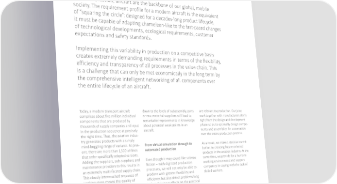 Aerospace Perfection at new heights Without question, aircraft are the backbone of our global, mobile society. The requirement pro昀椀le for a modern aircraft is the equivalent of “squaring the circle”: designed for a decades-long product lifecycle, it must be capable of adapting chameleon-like to the fast-paced changes of technological developments, ecological requirements, customer expectations and safety standards. Implementing this variability in production on a competitive basis creates extremely demanding requirements in terms of the 昀氀exibility, e昀昀iciency and transparency of all processes in the value chain. This is a challenge that can only be met economically in the long term by the comprehensive intelligent networking of all components over the entire lifecycle of an aircraft. Today, a modern transport aircraft down to the levels of subassembly, parts are relevant to production. Our joint comprises about 昀椀ve million individual or raw material suppliers will lead to work together with manufacturers starts components that are produced by remarkable improvements in knowledge right from the design and development thousands of supply companies and input about potential weak points in an phase so as to optimally design compo- in the production sequence at precisely aircraft. nents and assemblies for automation the right time. Thus, the aviation indus- over the entire production process. try generates products with a simply mind-boggling range of variants. At pres- From virtual simulation through to As a result, we make a decisive contri- ent, there are more than 1,500 airlines automated production bution to creating future-oriented that order speci昀椀cally adapted versions. products in the aviation industry. At the Adding the suppliers, sub-suppliers and Even though it may sound like science same time, we provide for a humane maintenance providers to this results in 昀椀ction – with digitized production working environment and support an extremely multi-faceted supply chain. processes, we will not only be able to companies in coping with the lack of This closely intermeshed sequence of produce with greater 昀氀exibility and skilled workers. working steps means the quality of e昀昀iciency, but also detect problems long every individual part and every process before they have e昀昀ects on the practical can determine the reliability and safety functional capability of an aircraft. of the produced aircraft. Within this complex sequence, knowledge of details, As a result, the path for the aviation no matter how small, is an important industry towards the uncompromising commodity. Today, it is a standard digitization of all processes is pre-or- feature of the aircraft industry for all dained. The development and design of components that are essential for aircraft has long since been veri昀椀ed �Our automation solutions with a wide operation, such as the jet engines and supported by virtual simulations in variety of specialized end e昀昀ectors and control systems, to be monitored almost every area. This applies to physi- can be seamlessly integrated into the by sensors. The increasing, digitized cal/technical properties just as much networked production lines of the networking of production processes as to the de昀椀nition of all processes that aviation industry. 2020�21�21