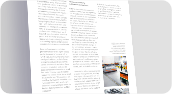 Mobile robotics The path is the goal. Future production and logistics will have Maximum autonomy for in the most cramped conditions. This to expand like a spring. This means flexi- mobile robots and platforms means the logistics area can be reduced bility is called for, not only for accelerated by up to 50 %, allowing more space to manufacturing but also for customized KUKA Navigation Solution knows the be used for production. In addition, products. Guaranteeing this flexibility destination and the best way to get there. KMP omniMove vehicles effortlessly cope will require significantly greater mobility – This navigation solution responds spon- with loads of up to 100 metric tons. irrespective of whether the mobility taneously to obstacles and modifications, It could not be more mobile. concepts involved are episodic, periodic and coordinates all known vehicles in or permanent. For this reason, KUKA is the system. Fully in line with Industrie 4.0, laying the groundwork for this techno- its software ensures planning and logy – with platforms that move auto- implementation of orders in a coordi- nomously and intelligently to transport nated way – even in conjunction with items or process workpieces. Or with higher-level control systems. It registers platforms that find their own way if data from safety laser scanners and radar required, align themselves with work- sensors, and uses the SLAM method pieces with millimeter precision or (simultaneous localization and mapping) respond adaptively to changing conditions to create a detailed map of the sur- in demanding logistics and production roundings. By means of this map, the Infallible sense of orientation: sequences through autonomous behavior. platform can respond to changes in mobile automation solutions the surroundings, which are a matter from 阀阀 昀椀nd the way to their destination with unerring Our mobile automation solutions of course in a flexible logistics system. certainty even within highly provide the basis for the highly flexible It’s good to know that the software, complex production environments. production world of Industrie 4.0, in which is not dependent on a hardware With or without heavy loads. which rigid, assembly line concepts are platform, can be used for different kine- consigned to history, and the future matic systems. It enables any motion belongs to productivity spaces that principles to be handled – and of course can be continuously optimized. Even also holonomic vehicles with Mecanum complete production units can be wheels, such as the KMP omniMove. repositioned somewhere else on an ad hoc basis. This new type of mobility These vehicles offer unrestricted maneu- sounds like science fiction. But at KUKA, verability in every direction, including it is scientific fact. This means we are rotating the robot about its own axis. providing the blueprint for mobile auto- As a freely scalable modular system, it mation solutions with which every can be precisely adapted to the specific industrial company can gear up for the requirements in terms of size, length flexible, digitally networked world of and width. With its omnidirectional production. wheels, the vehicle can be used even 阀阀 昀氀exMOVER CarryPick Automated guided Designed to be modular vehicle for the and multifunctional, smart factory: CarryPick from Swisslog the 阀阀 昀氀exMOVER consists of mobile racks is the 昀氀exible helper and automated guided for all requirements, vehicles for goods-to- from the distribution person picking. of materials through to integration in complex assembly systems. 38�39