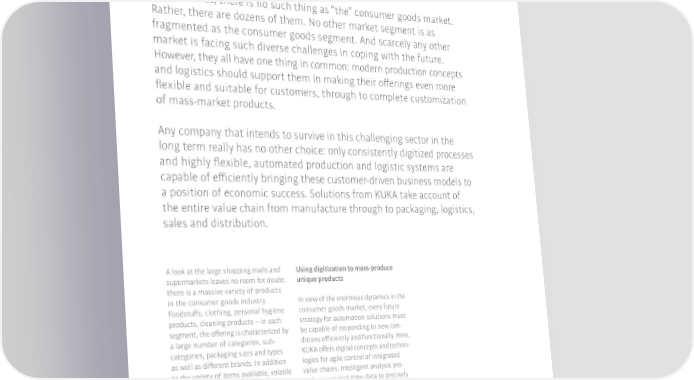 Consumer goods Customization requires production expertise. In actual fact, there is no such thing as “the” consumer goods market. Rather, there are dozens of them. No other market segment is as fragmented as the consumer goods segment. And scarcely any other market is facing such diverse challenges in coping with the future. However, they all have one thing in common: modern production concepts and logistics should support them in making their o昀昀erings even more 昀氀exible and suitable for customers, through to complete customization of mass-market products. Any company that intends to survive in this challenging sector in the long term really has no other choice: only consistently digitized processes and highly 昀氀exible, automated production and logistic systems are capable of e昀昀iciently bringing these customer-driven business models to a position of economic success. Solutions from 阀阀 take account of the entire value chain from manufacture through to packaging, logistics, sales and distribution. A look at the large shopping malls and Using digitization to mass-produce supermarkets leaves no room for doubt: unique products there is a massive variety of products in the consumer goods industry. In view of the enormous dynamics in the Foodstu昀昀s, clothing, personal hygiene consumer goods market, every future products, cleaning products – in each strategy for automation solutions must segment, the o昀昀ering is characterized by be capable of responding to new con- a large number of categories, sub- ditions e昀昀iciently and functionally. Here, categories, packaging sizes and types 阀阀 o昀昀ers digital concepts and techno- as well as di昀昀erent brands. In addition logies for agile control of integrated to the variety of items available, volatile value chains. Intelligent analysis pro- parameters in the business models are cedures use real-time data to precisely key factors in the success of the con- predict customer behavior and market sumer goods industry – for example, movements. It is not an exaggeration to global and regional trends, political say: any company that does not digitize in昀氀uences, new technological drivers, will be punished by the market. 阀阀 social taste and changes in values o昀昀ers customers a tailored solution for through to economic crises and natural each sector – in the area of Industrie 4.0 events. At the same time, it is apparent automation, this is achieved through that the number of product variants is the networking of the shop 昀氀oor with �Digital production permits business continuing to increase because of the data analytics tools, which enable us models that are individually adapted trend towards increasingly customized to better gauge the end users and their to customers and optimum control of products. responses. the entire process sequence. Hello Industrie 4.0�we connect you