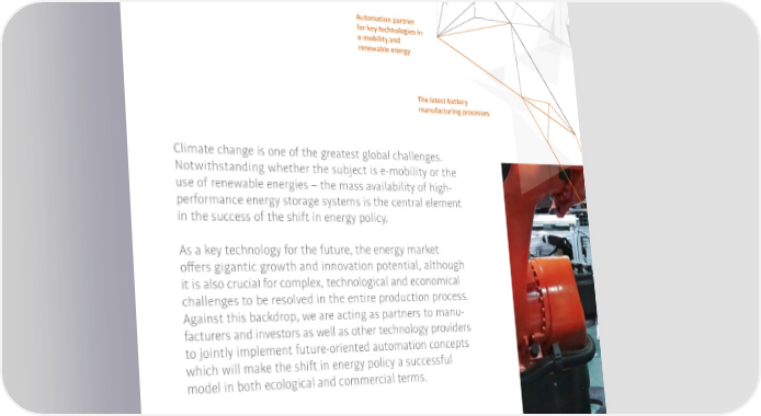 Energy On the side of the energy visionaries Automation partner for key technologies in e-mobility and renewable energy The latest battery manufacturing processes Climate change is one of the greatest global challenges. Notwithstanding whether the subject is e-mobility or the use of renewable energies – the mass availability of high- performance energy storage systems is the central element in the success of the shift in energy policy. As a key technology for the future, the energy market o昀昀ers gigantic growth and innovation potential, although it is also crucial for complex, technological and economical challenges to be resolved in the entire production process. Against this backdrop, we are acting as partners to manu- facturers and investors as well as other technology providers to jointly implement future-oriented automation concepts which will make the shift in energy policy a successful model in both ecological and commercial terms. Comprehensive documentation of production processes Hello Industrie 4.0�we connect you