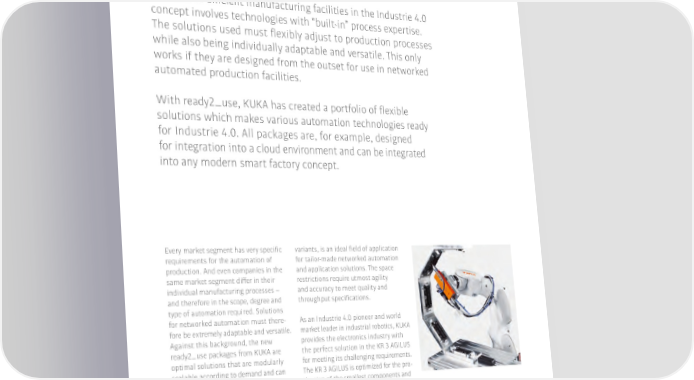KUKA ready2�use for 4.0 production Digital support with a high IQ The road to e昀昀icient manufacturing facilities in the Industrie 4.0 concept involves technologies with “built-in” process expertise. The solutions used must 昀氀exibly adjust to production processes while also being individually adaptable and versatile. This only works if they are designed from the outset for use in networked automated production facilities. With ready2�use, 阀阀 has created a portfolio of 昀氀exible solutions which makes various automation technologies ready for Industrie 4.0. All packages are, for example, designed for integration into a cloud environment and can be integrated into any modern smart factory concept. Every market segment has very speci昀椀c variants, is an ideal 昀椀eld of application requirements for the automation of for tailor-made networked automation production. And even companies in the and application solutions. The space same market segment di昀昀er in their restrictions require utmost agility individual manufacturing processes – and accuracy to meet quality and and therefore in the scope, degree and throughput speci昀椀cations. type of automation required. Solutions for networked automation must there- As an Industrie 4.0 pioneer and world fore be extremely adaptable and versatile. market leader in industrial robotics, 阀阀 Against this background, the new provides the electronics industry with ready2�use packages from 阀阀 are the perfect solution in the KR 3 AGILUS optimal solutions that are modularly for meeting its challenging requirements. scalable according to demand and can The KR 3 AGILUS is optimized for the pro- be adapted to the speci昀椀c system. duction of the smallest components and products. Its reach of 540 mm is ideally Fastening M1 screws with consistent tailored to the 60 cm x 60 cm surface of torque in a very short space of time and an average workplace in the electronics with the same quality and pose repeat- industry. Using a special screwdriver tool, ability – is a perfect 昀椀eld for a it masters the attachment of micro ready2�use application. The fast-moving screws in a wide range of positions with electronics sector, with its extremely utmost precision. It is the 昀椀rst six-axis short product lifecycles, its rapid pace robot for the fastening of type M0.8 to A delicate touch is called for: of innovation and its wide range of M2 screws on the global market. with great sensitivity, the KR 3 AGILUS fastens micro screws even with a diameter of just 0.8 mm! Hello Industrie 4.0�we connect you