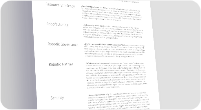 Preventive �Efficiently controlling necessary downtime. Preventive maintenance is usually carried out on the basis of fixed contracts, which provide for an inspection of critical elements of Maintenance the production systems at regular intervals or at fixed times. This may include analyses and cleaning the machines, for example. One of the advantages offered is the easy-to-plan and predictable maintenance times, which serve to prevent unforeseen downtime and ultimately save costs. Reshoring �Available is the new cheap. Whereas in the past purchase decisions were often primarily made on the basis of the lowest price, in the future it will be the product that is available most quickly and with a high level of customization that will be at the top of consumers’ shopping lists. This necessitates new manufacturing and marketing methods and structures that will only become possible as a result of networked production in smart factories. Short distances will be an important factor in achieving fast availability. Due to the high degree of automation, production steps that are currently outsourced to low-wage countries can be repatriated to high-wage countries in a process known as “reshoring”. Irrespective of wage structures, intelligent automation allows cost-efficient and high-quality production in the vicinity of the consumers. Resource E昀昀iciency �Sustainable production. The ability of humanity to handle the future will be determined by a responsible and sustainable approach to natural resources. In a just world, it may be assumed that ever more people will want to be supplied with ever better products. Flexible, intelligent and networked production as envisaged in Industrie 4.0 offers the opportunity of using raw materials more efficiently and more sustainably along the entire value chain and recycling them to a great extent for the sake of the planet. Robofacturing �Craftsmanship meets robotics. Unlike a conventional factory, with its high degree of uniform mass production, craft manufacturing combines the virtues of skilled craftsmanship with a low level of mechanization. Craft-manufactured products convince with high-quality and a distinctly unique character. Robofacturing unites the advantages of craft manufac- turing with the low price of a mass product, making individual and high-quality products affordable for large parts of the global population. Robotic Governance �Creating a responsible future world for generation “R”. Robotic governance is a concept which, among other things, considers the ethical/moral, socio-cultural, socio-political and socio-economic e昀昀ects of robotics on society and provides a framework for solving problems resulting from these changes. The governance principles include accountability, responsibility, transparency of structures and fairness. In this way, robotic governance helps to create a sustainable and responsible future world for the upcoming generation “R”. Robotic Natives �Robots as natural companions. Future generations, “robotic natives”, will see robots as the state of the art, as a lifestyle, or quite simply as normal. Just as commonplace as smartphones and the Internet, for example, are for the digital natives of today. They will have overcome the old human versus machine antagonism. The robot-oriented generation will shape a society that not only works differently, but also thinks differently. They will see the capabilities of robots as universal, networkable services that can be requested via the Internet and flexibly adapted to the requirements and desires of the individual at the click of a mouse. While nowadays robots are primarily known as work assistants in industrial processes, in the future they will be found in all areas of our daily lives as driverless cars, robo-furniture, carebots and a wide range of home and personal assistants. By 2050, a robot in every household will be part of everyday life. Security �No success without security. The issue of safety and security is one of the most multi- faceted business aspects of modern companies. In the separate worlds of production (OT) and information (IT), a basic distinction is made between safety and security: in OT con- texts, the term “safety” is used to refer to the safeguarding of people and machinery as well as the availability and reliability of production equipment. In the IT environment, the term “security” primarily relates to data security, integrity and con昀椀dentiality. OT and IT are merged in the networked world of Industrie 4.0, which brings the issue of safety and security to a new level of complexity. The use of cloud models and the networking of entire companies and organizations exacerbates the security aspects (see also Data Ownership). 阀阀 Consulting o昀昀ers well-founded advice on all safety and security questions and can draw on a broad network of expertise, including strategic alliances with international experts. VIII�IX