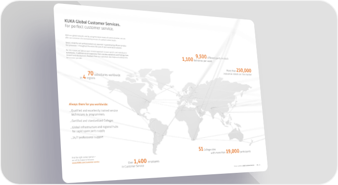 阀阀 Global Customer Services. For perfect customer service. With our global network, and by using the latest means of communication, we can o昀昀er our customers the outstanding service of a global market leader. Speed, reliability and professionalism are essential in guaranteeing e昀昀icient produc- tion processes – throughout the entire life cycle of your automation solution. For this reason, we take an open-minded approach to your specific and individual re- 9,500 di昀昀erent parts in stock quirements. In addition to our experience from everyday operations and findings from research and development, feedback from our customers also helps us to deliver the 1,100 deliveries per week best service possible. More than 250,000 70 subsidiaries worldwide industrial robots on the market in 4 regions Always there for you worldwide: � Qualified and excellently trained service technicians & programmers �Certified and standardized Colleges � Global infrastructure and regional hubs for rapid spare parts supply �24/7 professional support 51 College sites Find the right contact person – with more than 19,000 participants we will be happy to help you: www.阀阀.com/customer-service Over 1,400 employees in Customer Service Product portfolio_Global Customer Services 174_175