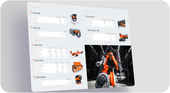 �Positioners / two-axis �Positioners / five-axis DKP HW KP5-V2S2V DKP500-2 HW DKP750-2 HW KP5-V2S2V500 KP5-V2S2V600 KP5-V2S2V1000 Rated payload 500 kg 750 kg Rated payload per side 500 kg 600 kg 1,000 kg Installation position Boden Boden Max. tool radius 600 mm 750 mm 600 mm Loading height 850 mm 850 mm (in steps of 200 mm) to 1,000 mm to 1,000 mm Tilting range ±90° ±90° Installation position Floor Floor Floor Hollow shaft Ø 60 mm 60 mm Swivel range ±185° ±185° ±185° Loading height 700 mm 635 mm 700 mm KP2-HV KP5-V2H2V HW KP2-HV500 KP5-V2H2V500 HW KP5-V2H2V750 HW Rated payload 500 kg Rated payload per side 500 kg 750 kg Installation position Floor, ceiling, wall, angle Max. tool radius 400 mm 400 mm Loading height 500 mm Installation position Floor Floor Tilting range ±135° Tilting range 0° / 90° 0° / 90° Loading height 863 mm 863 mm Hollow shaft Ø 60 mm 60 mm �Positioners / three-axis KP3-V2H KP3-V2H500-2 KP3-V2H750-2 KP3-V2H1000-2 KP3-V2H1500-2 Rated payload per side 500 kg 750 kg 1,000 kg 1,500 kg Distance between face plates 1,600 mm 1,600 mm 1,600 mm 1,600 mm (in steps of 200 mm) to 3,000 mm to 3,000 mm to 3,000 mm to 3,000 mm Max. tool radius 600 mm 600 mm 600 mm 600 mmm (in steps of 200 mm) to 1,000 mm to 1,000 mm to 1,000 mm to 1,000 mm Installation position Floor Floor Floor Floor Loading height 835 mm / 950 mm 835 mm / 950 mm 835 mm / 950 mm 835 mm / 950 mm Counterbearing hollow shaft Ø 68 mm 68 mm 68 mm 68 mm KP3-H2H KP3-H2H500 KP3-H2H750 KP3-H2H1000 Rated payload per side 500 kg 750 kg 1,000 kg Distance between face plates 1,600 mm 2,000 mm 2,000 mm (in steps of 400 mm) to 4,400 mm to 4,400 mm to 4,400 mm Max. tool radius 600 mm 600 mm 600 mm (in steps of 100 mm) to 800 mm to 800 mm Installation position Floor Floor Floor Loading height 1,019 mm 1,019 mm 1,019 mm Counterbearing hollow shaft Ø 68 mm 68 mm 68 mm KP3-V2MD KP3-V2MD2000 Rated payload per side 2,000 kg Installation position Floor Loading height 880 mm Hollow shaft Ø 139 mm Product portfolio_Postitioners 092_093