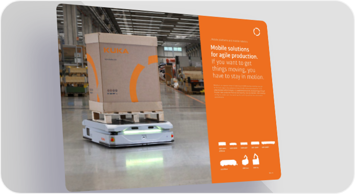 �Mobile platforms and mobile robotics Mobile solutions for agile production. If you want to get things moving, you have to stay in motion. Mobility is an important driver of Industry 4.0. 阀阀 develops mobility concepts for the next stage in the evolution of more flexible industrial production. In the cyber-physical world of Industry 4.0, established structures are becoming a thing of the past. Static production facilities and assembly lines are obsolete. 阀阀 develops intelligent, mobile units that work together perfectly and find their destination autonomously. KMP 600-S KMP 600W KMP 600P KMP 1500P KMP 3000P diffDrive omniMove KMR iiwa KMR iisy 094_095