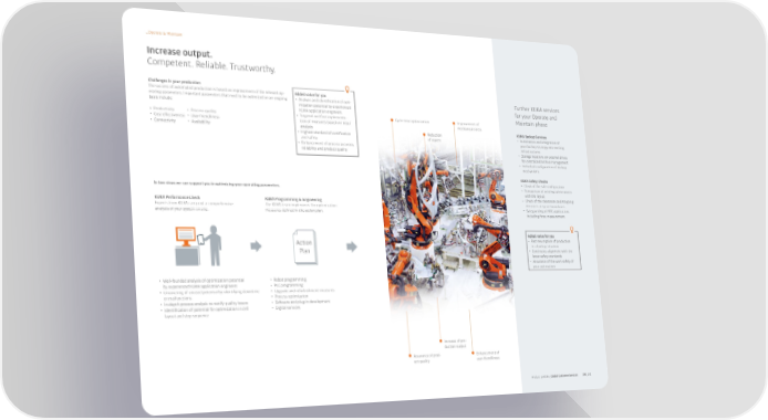 �Operate & Maintain Increase output. Competent. Reliable. Trustworthy. Challenges in your production The success of automated production is based on improvement of the relevant op- Added value for you Further 阀阀 services erating parameters. Important parameters that need to be optimized on an ongoing • Analysis and identification of opti- basis include: mization potential by experienced for your Operate and 阀阀 application engineers Maintain phase • Productivity • Process quality • Targeted and fast implementa- Cycle time optimization Improvement of • Cost-e昀昀ectiveness • User-friendliness tion of measures based on initial mechanical stress • Connectivity • Availability analysis Reduction 阀阀 Backup Services • Highest standard of certification of rejects • Automation and integration of and safety your backup strategy into existing • Enhancement of process accuracy, infrastructures reliability and product quality • Storage locations on external drives for centralized archive management • Individual configuration of backup mechanisms 阀阀 Safety Checks • Check of the safe configuration In two steps we can support you in optimizing your operating parameters. • Comparison of existing safety spaces with the layout 阀阀 Performance Check 阀阀 Programming & Engineering • Check of the clearances and stopping Experts from 阀阀 carry out a comprehensive The 阀阀 team implements the optimization distances at space boundaries analysis of your system on site. measures defined in the action plan. • Safeguarding of HRC applications including force measurement Added value for you • Fast resumption of production Action in a backup situation Plan • Continuous alignment with the latest safety standards • Assurance of the work safety of your automation • Well-founded analysis of optimization potential • Robot programming by experienced 阀阀 application engineers • PLC programming • Uncovering of unused potential by identifying downtime • Upgrade and refurbishment measures or malfunctions • Process optimization • In-depth process analysis to rectify quality issues • Software and plug-in development • Identification of potential for optimization in cell • Digital services layout and step sequence Increase of pro- duction output Assurance of prod- Enhancement of uct quality user-friendliness Product portfolio_Global Customer Services 190_191
