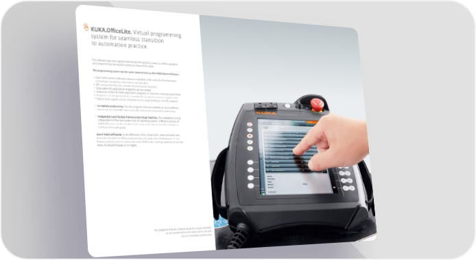阀阀.O昀昀iceLite. Virtual programming system for seamless transition to automation practice. The software uses the original 阀阀 SmartHMI and KRL syntax, so o昀昀line operation and programming correspond exactly to those of the robot. The programming system has the same characteristics as the 阀阀 System Software: • Each 阀阀 System Software release is available in full with all of the functions (a hardware periphery connection is not possible) • KRL syntax check by the compiler and interpreter provided • Executable KRL application programs can be created • Sequence control of robot application programs in real time: improved cycle times • Programs can be optimized on a standard PC at any time and on a regular basis • Digital input signals can be simulated to test signal polling in the KRL program • Immediate productivity. The KRL programs that are created can be transferred one-to-one to the 阀阀 robot controller and ensure immediate productivity. • Independent and flexible thanks to the virtual machine. The installation is thus independent of the host system and its operating system. Di昀昀erent versions of 阀阀.O昀昀iceLite can be installed at the same time and are therefore flexible in terms of their application. Use of 阀阀.O昀昀iceLite. 阀阀.O昀昀iceLite is the virtual 阀阀 robot controller and primarily intended for o昀昀line programming and application development. It can, however, also be used in conjunction with: 阀阀 robot training, application develop- ment, 阀阀.WorkVisual 6.0 or higher. The programs that are created using the virtual controller can be transferred to the robot one-to-one and ensure immediate productivity. Product portfolio_Simulation 156_157