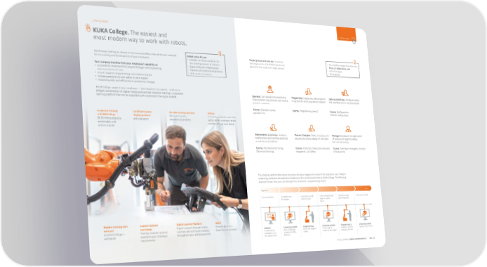 _Plan & Select click for more 阀阀 College. The easiest and most modern way to work with robots. 阀阀 leaves nothing to chance in this area and o昀昀ers state-of-the-art methods Added value for you Target groups and courses. To ensure • For complete range of courses, see for the training and development of your employees. • Globally certified standards for learning success, the 阀阀 courses are https://college.kuka.com the training process & trainers geared to the respective target groups. • All technologies Your company benefits from your employees’ capability to • State-of-the-art infrastructure • All locations • successfully implement the project through correct planning • Trainers with practical experience and assessment of risks • 50% practical content • ensure targeted programming and implementation • increase productivity and safety in your system • respond quickly and e昀昀iciently to production changes 阀阀 College supports your employees – from beginners to experts – with an in- telligent combination of digital media and practical in-person training – a powerful Operator. Can operate the equipment, Programmer. Creates the robot program- Start-up technician. Configures safety learning platform that can be expanded with customized training as needed. make program adjustments and resolve ming and the entire application program and interfaces to PLC and peripherals problem situations Course. Operator course, Course. Programming 1 and 2 Course. SafeOperation, In-person training Certified trainers On-site training sessions Online Operator Pro Profinet Configuration at 阀阀 College Highly qualified We come to you, E-learning modules and inter- 50:50 theory/practice and evaluated anywhere & anytime active online webinars in the combinable with comfort of your own home online modules Maintenance technician. Analyzes Planner/Designer. Plans, simulates and Manager. Decides on the application malfunctions and rectifies electrical ensures the correct design of the robot of robots with regard to safety, or mechanical problems ROI and technology Course. Mechanical Servicing, Course. 阀阀 Sim, Robot Selection and Course. Training for managers, individu- Electrical Servicing Integration, Cell Safety al focal points The modular and flexible course structure precisely targets the needs of the respective user. Modern e-learning modules and webinars complement the practical seminars at 阀阀 College. The following example shows how you can leverage this to become a programming expert. Beginner Expert Get an overview Establish basic Learn how to work Gain in-depth knowl- Expand your pro- Become an expert knowledge with the robot edge of specific gramming skills topics Modern training envi- Custom-tailored Digital Learner Platform Xpert ronment workshops Digital support through videos, Knowledge base – Certified Colleges – Training modules tailored tutorials and self-study modules Expertise on demand Webinar E-learning module Programming 1 E-learning module Programming 2 E-learning module worldwide exactly to your individual throughout your professional life Fundamentals Basic knowledge Move and program “Mastering” or Optimize motions, Optimize cycle times requirements of robotics, as a of robot cell, PLC, robots “Loads on the Robot” integrate sensors live online event field bus Product portfolio_Global Customer Services 182_183