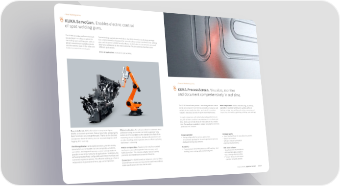 �Spot Welding series 阀阀.ServoGun. Enables electric control of spot welding guns. The 阀阀.ServoGun software technol- Two technology variants are available in the 阀阀.ServoGun technology package: ogy package is a software option for One is 阀阀.ServoGun Advanced for use with a force sensor installed on the welding controlling spot welding guns with an gun, and the other is 阀阀.ServoGunBasic, in which electric servomotors are used electric servomotor. It enables you to after force calibration by the robot controller. The two variants therefore cover use the external axes of the robot con- di昀昀erent applications. troller to control the servo gun. Areas of application: resistance spot welding �Process Monitoring series 阀阀.ProcessScreen. Visualize, monitor and document comprehensively in real time. The 阀阀.ProcessScreen process – monitoring software enables Areas of application: additive manufacturing, 3D printing, overall and component-oriented documentation, evaluation and application / painting / bonding, ARC welding, adhesive analysis of your production data – particularly for continu- bonding, sealing, laser welding and cutting, measuring and ous-path processes, but also for point-to-point processes. inspection, other welding (grinding, polishing, spot welding) Through comparison with individually configurable limit val- ues, the software can detect any violation of these limits and thus allows you to keep an eye on the quality of your produc- tion. The results are available in tabular and graphic overviews at the touch of a button. Easy installation. 阀阀.ServoGun is easy to configure E昀昀icient calibration. The software allows for automatic force thanks to its start-up wizard. Status keys make operating the calibration using an external, controller-supported force basic functions very straightforward. Thanks to the detailed sensor which is operated via the standard interface of the Simple operation Increased quality acceptance documentation, you can improve diagnosis and mastering sensor. In addition, background processes such • Freely configurable for various applications • Direct feedback from the manufacturing process logging after start-up. as robot handling provide greater process e昀昀iciency during • One software package for the entire production process • Data-driven analysis stationary tip dressing. • Reduced training requirements • E昀昀icient process optimization Flexible application. With 阀阀.ServoGun, you can use any • Optimal troubleshooting servomotors on the market that are compatible with 阀阀 Precise compensation. Thanks to the new force control Scalability controllers. An integrated operator control concept makes it mechanism, you achieve greater force accuracy with • Easy expansion to further processes: ARC welding, laser Web-based software possible to use inline forms for all applications. In addition, the 阀阀.ServoGun. This ensures a higher level of quality, welding, laser cutting, adhesive bonding, CNC • Visualization on any end device software provides freely configurable weld timer interfaces and precision and resistance to external influences. • All important data at a glance numerous expansion options. The e昀昀ective welding gun force is • Local storage of process data independent of gravitational force, age and temperature. Economical. For 阀阀.ServoGun Advanced, external force • Transfer of data to distributed external force sensors can now also be used in accordance customer networks possible 阀阀 specification can now also be used. Product portfolio_Application Software 138_139
