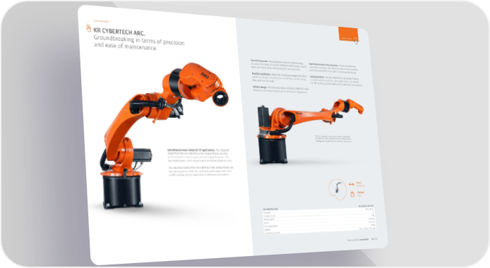 _Low payloads click for more KR CYBERTECH ARC. Groundbreaking in terms of precision and ease of maintenance. Fast and accurate. Particularly fast without compromising Optimized motion characteristics. Thanks to optimized accuracy: the robots of the KR CYBERTECH ARC product family controller structures, the industrial robots move smoothly work even faster while maintaining the same precision. and sensitively both on the path and during positioning. Flexible installation. Adapt the mounting arrangement of the Broad portfolio. The KR CYBERTECH ARC product family robots to suit your requirements: install them on the ceiling, is optimized for continuous-path applications, for example floor, wall or at an angle. for ARC welding and the application of adhesives and sealants. Athletic design. The industrial robots of the KR CYBERTECH ARC family are extremely compact yet streamlined in appearance. The KR CYBERTECH ARC product family is optimized for continuous flow applications, for example for ARC welding and the application of adhesives and sealants. Specialized process robots for CP applications. The industrial robots from the KR CYBERTECH ARC product family are char- acterized by their utmost precision and top performance. The low-maintenance series ensures particularly low follow-up costs. The industrial robots of the KR CYBERTECH ARC product family are specialized process robots for continuous-path applications such as ARC welding and the application of adhesives and sealants. Reach 2,101 mm Payload 8 kg KR CYBERTECH ARC KR 8 R2100-2 ARC HW Controller KR C5, KR C4 Number of axes 6 Rated payload 8 kg Reach 2,101 mm Pose repeatability ±0.04 mm Weight 260 kg Installation position Floor, ceiling, wall, angle Product portfolio_Low payloads 034_035