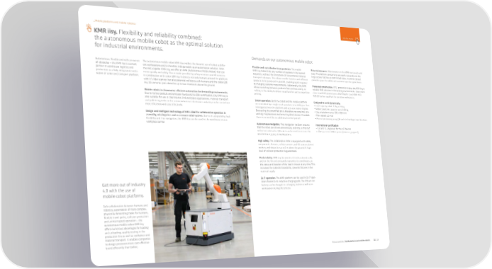 �Mobile platforms and mobile robotics click for more KMR iisy. Flexibility and reliability combined: the autonomous mobile cobot as the optimal solution for industrial environments. Demands on our autonomous mobile cobot Autonomous, flexible and with an eye on The autonomous mobile robot KMR iisy enables the dynamic use of cobot at di昀昀er- Flexible and cost e昀昀ective transportation. The mobile Easy maintenance. Maintenance on the KMR iisy is quick and all obstacles – the KMR iisy is a smart ent workstations and is therefore indispensable as an automation solution. With KMR iisy Cobot links any number of stations in the desired easy. The platform components are easily accessible via the partner in warehouse logistics and the HRC-capable KMR iisy, we o昀昀er an AMR (Autonomous Mobile Robot) that can sequence, without the limitations of conventional material large access hatches on both broad sides. A control cabinet production as a fully integrated combi- move quickly and safely. This is made possible by safety scanners and 3D cameras transport solutions. This allows smaller batches and di昀昀erent provides space for additional customer-specific applications. nation of cobot and transport platform. in combination with cobot LBR iisy. It detects not only humans around the platform products to be produced in parallel, enabling rapid response with it`s lidar scanner, but also potential collisions with humans and the cobot LBR to changing customer requirements. Additionally, the AMR Protected construction. IP 54 protection makes the KRM iisy a iisy. 3D cameras spot obstacles up to two meetwers above the ground. allows switching between products fast and less costly, re- reliable AMR solution in demanding environments. Clean room sulting in the ability to deliver small batches with competitive class 3 and ESD protection to ISO 61340-5-1 and ANSI ESD Mobile cobots in cleanrooms: e昀昀icient automation for demanding environments. pricing. S20.20 further qualify it for sensitive workspaces. Due to its low particle and emission levels and its ESD certification, the KMR iisy is also suitable for use in cleanrooms. Pick-and-place applications, material transport Smart operation. Both the cobot and the mobile platform Designed to work dynamically. and palletizing tasks in the semiconductor or electronics industry can be carried out are controlled by a single teach pendant, smartPAD pro. This • Load capacity cobot: 11 kg or 15 kg more e昀昀iciently and cost-e昀昀ectively. is integrated into the platform and acts as a status display. • Mobile platform capacity: up to 200 kg Decoupling the smartPad pro is therefore not required, pre- • Size of platform area: 695 × 850 mm Design and intelligent technology of AMR: ideal for collaborative operation in venting misplacement and ensuring direct access if needed. • Max. speed: 1,5 m/s assembly, intralogistics and as a service robot system. Due to its adaptability, high There is no need for an additional control pannel. • Precise positioning using QR code technology in workstations flexibility and free navigation, the KMR iisy can be used in the warehouse or as a workpiece carrier. Autonomous navigation. Free navigation via Slam ensures International certification that the robot can drive autonomously and stop in front of • ICE and FCC approval for the IoT devices unforeseen obstacles. QR codes can be used to increase the • TÜV Saar tested MRK system (robotics, grippers) positioning accuracy in workstations. High safety. The collaborative AMR is equipped with safety components. Sensors, safety scanners and 3D cameras detect workers and obstacles up to 2 m above the ground. A high level of collision protection is guaranteed. Predictability. KMR iisy documents its tasks automatically and on-the-fly and constantly transmits its coordinates, so the status and location of the load is known at any time. This increases the material traceability, prevents failures in the material supply. 24/7 operation. The AMR platform can be used in 24/7 oper- Get more out of Industry ation thanks to its inductive charging pads. The lithium-ion battery can be charged in a charging station as well as in 4.0 with the use of workstation during the process. mobile cobot platforms Safe collaboration between humans and robotics, automation of more complex, physically demanding tasks for humans, flexible travel paths, collision protection and uninterrupted operation – the autonomous mobile cobot KMR iisy o昀昀ers numerous advantages for loading and unloading, quality testing in the production line as well as workpiece and material transport. It enables companies to design processes more cost-e昀昀ective- ly and e昀昀iciently than before. Product portfolio_Mobile platforms and mobile robotics 112_113