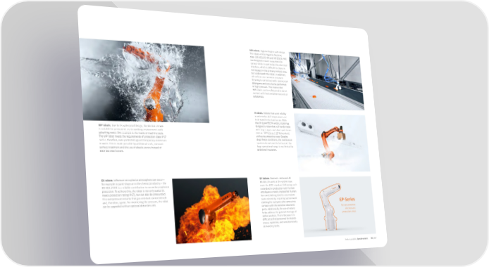 HM robots. Hygiene begins with design. The robots of the Hygienic Machine class (KR AGILUS HM and KR DELTA HM) are designed in such a way that dirt cannot settle. In particular, the electrical interface, which is di昀昀icult to clean, is not located in the primary contact area, but underneath the robot. In addition, all surfaces are corrosion-resistant. Cleaning is carried out with commercial detergents and can also be performed at high pressure. This means that HM robots can be safely used in direct contact with food and pharmaceutical substances. A robots. Robots that work reliably in extremely cold temperatures are in demand in the food sector. With the KR QUANTEC PA Arctic, 阀阀 has WP robots. Due to its waterproof design, the KR AGILUS WP designed a robot that will handle tasks is suitable for permanent use in working environments with with large ranges and short cycle times splashing water. One example is the inside of machine tools. even at -30° Celsius (-22° Fahrenheit) The WP robot meets the requirements of protection class IP 67 without a protective cover. Despite and is, therefore, even protected against temporary immersion depp freeze conditions, the mechanical in water. This is made possible by additional seals, constant systems do not need to be heated. The surface treatment and the use of plastic covers instead of large operational range is not limited by stainless steel covers. additional insulation. EX robots. Wherever an explosive atmosphere can occur – EP Robots. Desired – delivered: All for example in paint shops or in the chemical industry – the KR AGILUS units in the system now KR AGILUS EX is a reliable contribution to secondary explosion meet the ESD⁺ standard. Achieving such protection. To achieve this, the robot is not only sealed (it a standard in production with human meets protection rating IP 67), but can also be pressurized. employees is nearly impossible: human This overpressure ensures that gas and dust cannot intrude hair and clothing tend to accumulate and, therefore, ignite. For monitoring the pressure, the robot static electricity, requiring special work can be upgraded with an optional detection unit. clothing for everyone who comes into EP-Series contact with the sensitive electronic for very sensitive parts. Additionally, the use of robots electrostatic helps address the general shortage of protection areas skilled workers. This is because it is di昀昀icult to find personnel for monot- onous, repetitive, and simultaneously demanding tasks. Product portfolio_Special variants 066_067
