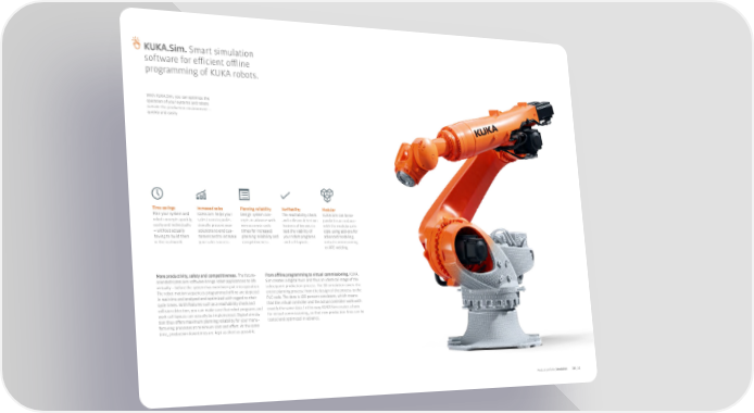 阀阀.Sim. Smart simulation software for e昀昀icient o昀昀line programming of 阀阀 robots. With 阀阀.Sim, you can optimize the operation of your systems and robots outside the production environment – quickly and easily. Time savings Increased sales Planning reliability Verifiability Modular Plan your system and 阀阀.Sim helps your Design system con- The reachability check 阀阀.Sim can be ex- robot concepts quickly, sales team to profes- cepts in advance with and collision detection panded in accordance easily and individually sionally present your very accurate cycle features allow you to with the modular prin- – without actually solutions to end cus- times for increased test the viability of ciple using add-ons for having to build them tomers and to increase planning reliability and your robot programs advanced modeling, in the real world. your sales success. competitiveness. and cell layouts. virtual commissioning or ARC welding. More productivity, safety and competitiveness. The future- From o昀昀line programming to virtual commissioning. 阀阀. oriented 阀阀.Sim software brings robot applications to life Sim creates a digital twin and thus an identical image of the virtually – before the system has even been put into operation. subsequent production process. The 3D simulation covers the The robot motion sequences programmed o昀昀line are depicted entire planning process: from the design of the process to the in real time and analyzed and optimized with regard to their PLC code. The data is 100 percent consistent, which means cycle times. With features such as a reachability check and that the virtual controller and the actual controller work with collision detection, you can make sure that robot programs and exactly the same data. In this way, 阀阀.Sim creates a basis work cell layouts can actually be implemented. Digital simula- for virtual commissioning, so that new production lines can be tion thus o昀昀ers maximum planning reliability for your manu- tested and optimized in advance. facturing processes at minimum cost and e昀昀ort. At the same time, production downtimes are kept as short as possible. Product portfolio_Simulation 150_151