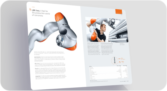 _Cobots click for more LBR iiwa. A feel for the production world of tomorrow. Industrial change is in full swing. IoT are mobile, highly flexible and extremely Greater freedom. The LBR iiwa does not and Industry 4.0 are replacing estab- versatile. At the same time, they provide require a safety fence. lished structures with a cyber-physical you with seamless digital networking production environment. The active and autonomous adjustment to the agents in this process of change are rapidly changing production require- intelligent machines with completely ments. 阀阀 is making the vision of a new capabilities: robots equipped with production environment free from rigid sensitivity and superior intelligence. structures a reality. As part of this, light- With the arrival of the LBR iiwa – one of 阀阀’s lightweight cobots specializing in Working side-by-side with humans, they weight robots (LBR) play a key role as sensitive assembly work – safety fences make way for human-robot collaboration in operate more independently and with “intelligent industrial work assistants” the workspace. more sensitivity than ever before. They (iiwa). In short: LBR iiwa. Quick reactions. Thanks to its joint torque sensors, the LBR iiwa detects contact immediately, and reduces its level of force and speed instantly. Its position and com- Reach pliance control enables it to handle delicate components without creating crushing 800 – 820 mm and shearing hazards. Able to learn. Choose from three operating modes and program the LBR iiwa by Payload means of simulation: show it the desired position – and it remembers the coordinates 7 – 14 kg of the point on the path. Stop for breaks and control it with simple touch commands. Sensitive. The lightweight LBR iiwa with its high-performance servo control is able LBR iiwa LBR iiwa 14 R820 LBR iiwa 7 R800 to detect contours quickly under force control. It establishes the correct installation Rated payload 14 kg 7 kg Number of axes 7 7 position and mounts components quickly and with the utmost precision with an ax- Reach 820 mm 800 mm is-specific torque accuracy of ±2 percent of the maximum torque. The LBR iiwa can Wrist variant In-line wrist In-line wrist also find small, delicate components in next to no time without your assistance. Mounting flange on axis 7 DIN ISO 9409-1-A50 DIN ISO 9409-1-A50 Pose repeatability ±0.15 mm ±0.1 mm Independent. The LBR iiwa’s controller, 阀阀 Sunrise Cabinet, simplifies the quick Axis-specific torque accuracy ±2 % ±2 % start-up of even complex applications. Give your operator a third hand – and have the Weight 29.9 kg 23.9 kg LBR iiwa take care of unergonomic, monotonous tasks reliably and independently. Protection rating IP 54 IP 54 Variants CR CR Installation position Floor, ceiling, wall Floor, ceiling, wall CR Suitable for cleanrooms The technical data in the tables applies exclusively to standard versions. Product portfolio_Cobots 012_013