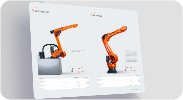 �Foundry �Foundry KR CYBERTECH KR IONTEC The Foundry robot from our proven The KR IONTEC combines compact de- KR CYBERTECH family. sign with the largest working envelope in its class for optimum use of space with a small footprint. Equipped with a waterproof and dustproof in-line wrist and protected motors, the robot is suit- able for almost every area of application. A Foundry option also enables use in extremely hot environments with an expanded temperature range of 0 to 55 °Celsius. Reach Reach 2,010 mm 2,101 – 2,501 mm Payload Payload 20 kg 50 – 70 kg KR CYBERTECH KR 20 R1810-1 F KR 20 R2010-1 KS-F KR IONTEC KR 70 R2100 F KR 50 R2500 F Controller KR C5, KR C4 KR C5, KR C4 Controller KR C5, KR C4 KR C5, KR C4 Number of axes 6 6 Number of axes 6 6 Rated payload 20 kg 20 kg Rated payload 70 kg 50 kg Reach 1,813 mm 2,010 mm Reach 2,101 mm 2,501 mm Pose repeatability ±0.04 mm ±0.04 mm Pose repeatability ±0.05 mm ±0.05 mm Weight 250 kg 242 kg Weight 536 kg 559 kg Variants F F Variants F F Installation position Floor, ceiling, wall, angle Floor (shelf) Installation position Floor, ceiling, wall, angle Floor, ceiling, wall, angle Product portfolio_Foundry 070_071