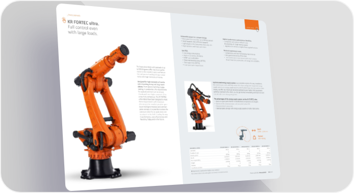 _Heavy payloads click for more KR FORTEC ultra. Full control even Unbeatable power in a compact design. Highest performance and maximum flexibility. with large loads. • Most powerful in its class: up to 800 kg payload • Compatible with tools of di昀昀erent sizes • Small footprint: 950 × 970 mm footprint by selecting a HI (High Inertia) version • Lightweight in the heavy-duty class: only 2.2 t • Upgrade to HI version or higher/lower payload versions • High dynamics with low cycle times Reduced maintenance costs. Low TCO. • Components with low maintenance requirements • Low energy consumption • Very good accessibility of the robot • Highest availability: 99.998 % • Low maintenance requirements with only 3 actions: • MTBF: up to 400,000 h Visual inspection, lubrication, oil change every 20,000 h. • Short maintenance time (MTTM) • Fast repair time (MTTR) • Low spare parts requirement The heavy-duty robots with payloads of up to 800 kilograms o昀昀er maximum perfor- mance in the smallest space and feature fast and precise handling of large compo- nents with high moments of inertia. Designed for high moments of inertia Sophisticated energy supply system. Our complete solution for easy installation, when handling heavy and large work- low maintenance costs and long service life. From configurator-supported energy pieces. From battery handling to giga- supply systems to energy supply systems with flexible K-pipe for more pr ecise move- casting. In production, the requirements ments, we o昀昀er you individual solutions tailored to your needs. With equipment for payload and reach are increasing perfectly matched to the robot, you can get started immediately and save time and sharply with ever higher moments of in- considerable costs during integration. ertia of the workpieces. The KR FORTEC The advantages of the energy supply system on the KR FORTEC ultra. ultra robots have been designed to meet • Saves on spare parts thanks to standardized components and lengths these requirements with maximum • Optimized for minimum wear and increased service life e昀昀iciency in the smallest possible space. • Improved pinch protection As an intelligent modular and common • Identical parts concept with energy supply systems of other robot series parts concept, it is possible to select the optimum robot for an application and to adapt it in the field. Leading the way in performance, cost-e昀昀ectiveness and flexibility. Today and in the future. Reach 2,800 – 3,700 mm Payload 480 – 800 kg KR FORTEC-2 ultra KR 480 R3400-2 KR 480 R3700-2 KR 560 R3100-2 KR 640 R2800-2 KR 800 R2800-2 Controller KR C5 KR C5 KR C5 KR C5 KR C5 Number of axes 6 6 6 6 6 Rated payload 480 kg 480 kg 560 kg 640 kg 800 kg Reach 3,400 mm 3,700 mm 3,100 mm 2,800 mm 2,800 mm Pose repeatability ±0.08 mm ±0.08 mm ±0.08 mm ±0.08 mm ±0.08 mm Weight 2,140 kg 2,460 kg 2,170 kg 2,170 kg 2,400 kg Variants F F F, HI F, HI F Installation position Floor Floor Floor Floor Floor HI Hight Inertia (optimized for highest mass inertias) The technical data in the table applies exclusively to standard versions. Product portfolio_Heavy payloads 048_049