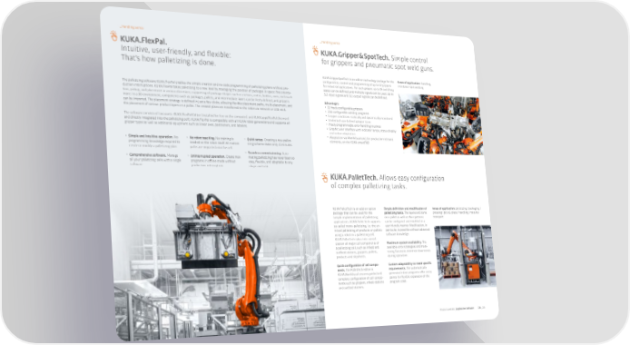 �Handling series �Handling series 阀阀. FlexPal. 阀阀.Gripper&SpotTech. Simple control Intuitive, user-friendly, and flexible: for grippers and pneumatic spot weld guns. That's how palletizing is done. 阀阀.GripperSpotTech is an add-on technology package for the Areas of application: handling, configuration, control and programming of up to 32 grippers resistance spot welding for industrial applications. For each gripper, up to 16 switching The palletizing software 阀阀.FlexPal enables the simple creation and no-code programming of palletizing plans without pro- states can be defined, and multiple signals can be used. Up to duction interruptions. 阀阀.FlexPal takes palletizing to a new level by managing the position of packages in space: free orienta- 512 input signals and 512 output signals can be defined. tion, pickup, and placement in various directions, supporting all package shapes such as cartons, crates, bottles, cans, and much more. In a 3D environment, components such as packages, pallets, and intermediate layers can be freely defined, and grippers Advantages can be imported. The placement strategy is defined in just a few clicks, allowing flexible placement paths, multi-placement, and • 32 freely configurable grippers the placement of various product layers on a pallet. The created plans are transferred to the robot via network or USB stick. • 256 configurable welding programs • Gripper conditions statically and dynamically monitored The software consists of two parts: 阀阀.FlexPal Editor (installed for free on the computer) and 阀阀.app4FlexPal (licensed • Unlimited user-defined gripper icons and directly integrated into the palletizing cell). 阀阀.FlexPal is compatible with all 阀阀 robot generations and supports all • Freely programmable error handling routines gripper types as well as additional equipment such as linear axes, positioners, and labelers. • Graphic user interface with indicator lamps, status display and online adaptation • Adaptation via WorkVisual and, for production-relevant • Simple and intuitive operation. No • No robot teaching. No training is • Quick setup. Creating a new pallet- elements, on the 阀阀 smartPAD programming knowledge required to needed on the robot itself. All motion izing scheme takes only 15 minutes. create or modify a palletizing plan. paths are imported into the cell. • Seamless commissioning. Auto- • Comprehensive software. Manage • Uninterrupted operation. Create new mating palletizing has never been so all your palletizing cells with a single programs in o昀昀line mode without easy, flexible, and adaptable to any software. production interruption. shape and task. 阀阀.PalletTech. Allows easy configuration of complex palletizing tasks. 阀阀.PalletTech is an add-on option Simple definition and modification of Areas of application: palletizing / packaging / package that can be used for the palletizing tasks. The layers and items pressing / pick & place / handling / material simple implementation of palletizing on a pallet as well as their patterns transport applications. 阀阀.PalletTech supports can be configured and modified in a so-called mono-palletizing, i.e. the un- user-friendly manner. Modification, in mixed palletizing of products on pallets particular, is possible without advanced using a robot in a palletizing cell. software knowledge. 阀阀.PalletTech takes into consid- eration all major cell components of Maximum system availability. The a palletizing cell, such as infeed and available error strategies and moni- outfeed stations, grippers, pallets, toring functions minimize downtimes products and slipsheets. during operation. Quick configuration of cell compo- Custom adaptability to meet specific nents. The PalletTech editor in requirements. The automatically 阀阀.WorkVisual ensures guided and generated robot programs o昀昀er entry complete configuration of cell compo- points for flexible expansion of the nents such as grippers, infeed stations program code. and outfeed stations. Product portfolio_Application Software 134_135