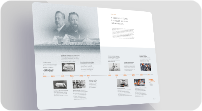 �About 阀阀 A tradition at 阀阀: Innovation for more value creation. Today, 阀阀 is an internationally active automation group with sales of around 3.3 billion euros. The company is headquar- tered in Augsburg, Germany. As one of the world’s leading suppliers of intelligent automation solutions, 阀阀 o昀昀ers customers everything they need from a single source: from robots and cells to fully automated systems and their net- working in markets such as automotive, electronics, metal & plastic, consumer goods, e-commerce/retail and healthcare. Hand in hand with 阀阀 types its way into new product areas. Famulus, the robotics pioneer. the robotic colleague. Measuring just 64 millimeters in height 阀阀 wrote history as a robotics The LBR iiwa is the world’s first and weighing five kilograms: the compact pioneer with the world’s first series-produced sensitive robot “Princess” portable typewriter – a marvel industrial robot with six electric approved for direct human- of precision mechanics – is born. Innovative welding technologies. motor-driven axes. 阀阀 as complete solution. robot collaboration (HRC). How it all started. 阀阀 establishes a new welding On behalf of the Chrysler Johann Josef Keller and Jakob technology: friction welding. Group, 阀阀 establishes 阀阀 Knappich founded an acetylene Numerous other innovations Toledo Production Operations gas plant in Augsburg. follow in the ensuing years, such in North America for the inte- as short-cycle welding and de- grated production of the body fined-angle friction welding. of the Jeep Wrangler. 1898 1920 1949 1956 1966 1971 1973 2001 2006 2007 2013 2023 Taking a strong line with 阀阀 robots. Europe’s first robot- operated welding Today. transfer line is built 125 years for Daimler-Benz. of 阀阀 Portfolio and market expansion. Success through automation. Robots in medicine. World record holder with six axes. 阀阀 has established itself as The first automatic welding system 阀阀 robots are used in the world’s Payload capacity exceeds the the market leader in the field for refrigerators and washing first robot-controlled radiation magic mark of 1,000 kilograms. of municipal vehicles in Europe. machines is market-launched surgery system – the “Cyberknife”. The 阀阀 KR titan receives an by 阀阀. 阀阀 also delivers The system enables the treatment of entry in the Guinness Book of the first multi-spot welding inoperable, surgically complex tumors. Records as the world’s strongest transfer line to Volkswagen AG. six-axis industrial robot. 004_005