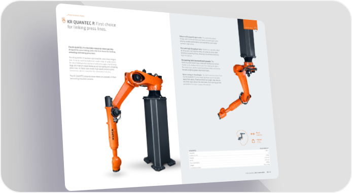 �Press-to-press robots click for more KR QUANTEC P. First choice for linking press lines. Robust with powerful gear units. The extremely robust design with reinforced axes and highly resistant gear units ensures reliable performance and availability even under constant high stress. Fast with high throughput rates. Thanks to a specially adapt- ed drive train, and machine data, the press-to-press robot The KR QUANTEC P is the 阀阀 industrial robot specially shortens processing times, allowing it to achieve extremely designed for press linking and is the first choice for loading, high throughput. unloading and linking press lines. Far-reaching, both downwards and upwards. The The KR QUANTEC P has been optimized for press shop integra- shelf-mounted robots have a reduced interference contour tion. It can be used to implement a wide range of applications, thanks to the hollow shaft in axis 1 for routing all cables. for press linking across narrow or wide press gaps, transferring The robot knee, which is positioned lower down and further large and medium-sized blanks as well as loading and unloading forward, enables greater downward reach. press lines. Its faster axes enable high-speed press-to-press automaton, which is ideal for the automotive industry. Space-saving at a low height. The shelf-mounted robots from the KR QUANTEC P series make optimum use of the work- The KR QUANTEC press-to-press robots are available in floor space from above. Thanks to their low height, they require and ceiling-mounted variants. very little space above the robot base, thus opening up new possibilities for space-saving cell concepts. Reach 3,505 mm Payload 120 kg KR QUANTEC KR 120 R3500-2 P Controller KR C5 Number of axes 6 Payload 120 kg Reach 3,505 mm Pose repeatability ±0.05 mm Weight 1,281 kg Installation position Floor, ceiling Product portfolio_Press-to-press robots 060_061