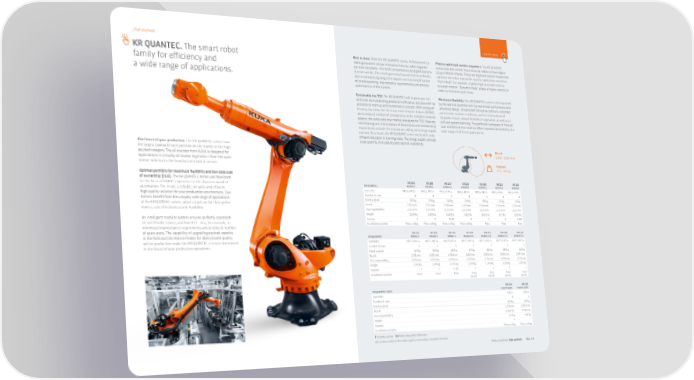_High payloads click for more KR QUANTEC. The smart robot Best in class. With the KR QUANTEC series, 阀阀 presents a Process-optimized motion sequences. The KR QUANTEC robot generation whose innovative features taken together series were the world’s first industrial robots to have digital family for e昀昀iciency and set new standards – for both conventional and digitalized pro- plug-in Motion Modes. These are digitized motion modes that duction worlds. The result goes way beyond technical details, optimize the robot motion for specific application scenarios. a wide range of applications. also encompassing long-term aspects such as simplification “Path Mode”, for example, enables high-precision continu- of commissioning, maintenance requirements and process ous-path motion. “Dynamic Mode” allows a higher velocity in optimization of the system. order to minimize cycle times. Sustainably low TCO. The KR QUANTEC will impress you not Maximum flexibility. The KR QUANTEC series is distinguished only with its outstanding production e昀昀iciency, but also with its by the optimal portfolio with its maximized performance and economical start-up and maintenance concept. With energy ef- advanced design. Streamlined disruptive contours, extended ficiency, top values for the mean time between failures (MTBF) permissible ambient conditions and an extremely small and a reduced number of components in the complete modular footprint ensure utmost flexibility in operation, as well as in system, the series sets new market standards for TCO. Features cell and system planning. The perfected workspace in front of, contributing to a minimization of downtimes and maintenance over and behind the machine o昀昀ers improved accessibility in a requirements include the innovative cabling and energy supply wide range of di昀昀erent applications. concept. As a result, the KR QUANTEC series excels with a sig- nificant reduction in running costs. The energy supply concept is set apart by its durability and optimal availability. The future of your production. The KR QUANTEC robots have Reach the largest payload/reach portfolio on the market in the high 1,573 – 3,904 mm payload category. The all-rounder from 阀阀 is designed for applications in virtually all market segments – from the auto- Payload motive industry to the foundry and medical sectors. 120 – 300 kg Optimal portfolio for maximum flexibility and low total cost of ownership (TCO). The KR QUANTEC series was developed KR 300 KR 250 KR 240 KR 210 KR 180 KR 210 KR 150 on the basis of 阀阀’s experience in the dynamic world of KR QUANTEC R2700-2 R2700-2 R2900-2 R3100-2 R2900-2 R2700-2 R3100-2 automation. The result: a reliable, versatile and e昀昀icient Controller KR C5, KR C4 KR C5, KR C4 KR C5, KR C4 KR C5, KR C4 KR C5, KR C4 KR C5, KR C4 KR C5, KR C4 high-quality solution for your production environment. Cus- Number of axes 6 6 6 6 6 6 6 tomers benefit from the uniquely wide range of applications Rated payload 300 kg 250 kg 240 kg 210 kg 180 kg 210 kg 150 kg of the KR QUANTEC robots, which stand out for their perfor- Reach 2,701 mm 2,701 mm 2,900 mm 3,100 mm 2,900 mm 2,701 mm 3,100 mm mance, cost-e昀昀ectiveness and flexibility. Pose repeatability ±0.05 mm ±0.05 mm ±0.05 mm ±0.05 mm ±0.05 mm ±0.05 mm ±0.05 mm Weight 1,101 kg 1,101 kg 1,120 kg 1,134 kg 1,105 kg 1,077 kg 1,105 kg An intelligent modular system ensures perfectly coordinat- Variants F F F, HO F F F F, HO ed and flexible robots, and low TCO – due, for example, to Installation position Floor, ceiling Floor, ceiling Floor, ceiling Floor, ceiling Floor Floor Floor minimized maintenance requirements and a reduced number of spare parts. The capability of upgrading payload capacity KR 150 KR 120 KR 120 KR 270 KR 210 KR 180 KR 120 in the field and the Motion Modes for ideal process quality KR QUANTEC R2700-2 R3100-2 R2700-2 R3100-2 K R3300-2 K R3500-2 K R3900-2 K within production make the KR QUANTEC a secure investment Controller KR C5, KR C4 KR C5, KR C4 KR C5, KR C4 KR C5, KR C4 KR C5, KR C4 KR C5, KR C4 KR C5, KR C4 in the future of your production operations. Number of axes 6 6 6 6 6 6 6 Rated payload 150 kg 120 kg 120 kg 270 kg 210 kg 180 kg 120 kg Reach 2,701 mm 3,100 mm 2,701 mm 3,105 mm 3,305 mm 3,505 mm 3,904 mm Pose repeatability ±0.05 mm ±0.05 mm ±0.05 mm ±0.05 mm ±0.05 mm ±0.05 mm ±0.05 mm Weight 1,072 kg 1,105 kg 1,069 kg 1,260 kg 1,266 kg 1,256 kg 1,280 kg Variants F F F, HO F F F – Installation position Floor Floor Floor Floor Floor Floor Floor (shelf) (shelf) (shelf) (shelf) KR 160 KR 120 KR QUANTEC nano R1570 nano R1800 nano Controller KR C4 KR C4 Number of axes 6 6 Rated payload 160 kg 120 kg Reach 1,573 mm 1,803 mm Pose repeatability ±0.06 mm ±0.06 mm Weight 677 kg 684 kg Variants – – Installation position Floor, ceiling Floor, ceiling F Foundry variant HO Food compatible lubricants The technical data in the tables applies exclusively to standard versions. Product portfolio_High payloads 042_043