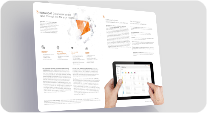 阀阀 iiQoT. Data-based added value through IIoT for your robots. 阀阀 cloud solution: The advantages of uncomplicated, secure, cost-e昀昀ective our cloud-based IIoT solution Data-based automation made easy. One platform for all robots: Big Data for monitoring, Secure connection. Security matters: the data are located on Maximize the operating time of your visualization and troubleshooting. What condition is your a European server. They are optimally protected from loss and robot fleet with 阀阀 iiQoT. The central robot in? How e昀昀iciently is it working? And what about the failures. IIoT (Industrial internet of things) entire robot fleet at your company? 阀阀 iiQoT has an eye on platform supplies all important data all the condition data: from hardware to software and on to Up to date at all times. You do not have to worry about in real time, making not only remote the controller. The central platform leverages the advantages operation or maintenance, but always have access to the monitoring of the robot systems but of the Industrial Internet of Things and bundles the data of latest version. also troubleshooting more e昀昀icient. a complete robot fleet transparently and clearly in one dash- board. You can access it around the clock from any location. Scalability. Scaling tailored to your needs: robots can be added The most important functions include systems management, to or removed from the fleet as desired. preventive maintenance, fault detection as well as warning messages. Instead of simply visualizing raw data, 阀阀 iiQoT High availability. Enhanced performance and availability: Your delivers supplementary orientation parameters, enabling mes- processes run reliably and there is no need for time-consum- sages to be easily interpreted and faults e昀昀iciently rectified. ing system recovery. The IIoT platform, implemented by 阀阀 subsidiary Device Insights, is suitable for small and large fleets – and clears the Reduced costs. No complex hardware (expensive maintenance) way for the Smart Factory. at your company required. A gateway or existing hardware can be used. Optimization Fault finding Clear and quick Increased Independent of location and device. Access robot fleet data of the fleet and troubleshooting overview e昀昀iciency from anywhere at any time: 阀阀 iiQoT o昀昀ers maximum • Management of systems • Notification of problems • Transparency across the • Safeguarding system flexibility. and machines • Saving time during fault entire robot fleet due to productivity • Checking safety finding IIoT technologies • Identifying potential for • Robot maintenance • Increasing availability • Remote monitoring outside improvement in the indus- production halls trial environment • Access to all required data • Targeted actions from all devices One platform for all robots: monitoring, visualization and IIoT: easy to use, for any industrial requirement. 阀阀 iiQoT troubleshooting. What condition is your robot in? How e昀昀i- is characterized by an expandable software ARChitecture. iiQoT ciently is it working? And what about your company's entire is modular in structure, which allows us to respond flexibly to robot fleet? 阀阀 iiQoT has an eye on all the condition data: a wide range of customer requirements. This makes it easy to from hardware to software, and on to the controller. The central find your way around and provides you with valuable functions platform leverages the advantages of the Industrial internet of depending on your industrial application requirements. things and bundles the data of a complete robot fleet transpar- ently and clearly in one dashboard. You can gain access from Avoiding production downtime thanks to IIoT application anywhere, around the clock. The most important functions The IIoT software from 阀阀 is strongly oriented towards the include systems management, preventive maintenance, fault needs of companies: minimizing downtime and maximizing detection as well as warning messages. Instead of simply visu- operating time. This is achieved through the optimal inter- alizing raw data, 阀阀 iiQoT delivers supplementary orientation action of various modules, such as “Condition Monitoring”, parameters, enabling messages to be easily interpreted and “Fault Diagnosis” and “Changelog”. It is thus possible to faults e昀昀iciently rectified. The IIoT platform, implemented by identify and respond to faults quickly. 阀阀 iiQoT users can 阀阀 subsidiary Device Insight, is suitable for small and large log into the corresponding robot in the selected line and cell fleets – and paves the way for the smart factory. in order to view the problem. If troubleshooting does not succeed in the first step, you can quickly access diagnostic data via “Fault Diagnosis”. Premium version iiQot.Advanced. With the premium version 阀阀 iiQoT.Advanced, which is subject to a fee, we o昀昀er you additional applications beyond the core functions that enable you to plan maintenance and servicing work even more precisely, avoid downtimes, optimise production cycles and measure energy consumption. Product portfolio_Cloud-based services 168_169
