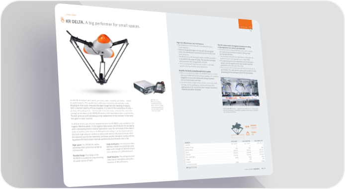 _Small robots click for more KR DELTA. A big performer for small spaces. High cost-e昀昀ectiveness, low maintenance The HM version meets the hygiene standards according • No replacement of the lubricant in the reduction gears to the regulations for contact with foodstu昀昀s is ever required. • The entire body is made of stainless steel, and is smooth, • With an encapsulated gear unit and self-lubricating ball dirt-repellent and corrosion-resistant, making it easy joints, the maintenance requirements of the KR DELTA are to clean and disinfect. particularly low. • The protection rating for the robot body is IP 67, while the • The KR C5 micro, the latest generation of 阀阀 controllers, fourth axis meets the high protection rating IP 69K. is included in the scope of supply. This requires less space • The materials used for the robot body and for lubrication and consumes little energy at only 230 volts. comply with the regulations for food contact materials • Direct cleaning with high-pressure cleaners is possible, published by the FDA and in the LFGB. greatly reducing cleaning-related downtime. • Direct contact of the robot body with food and medicines is permissible. This robot variant is particularly suitable for food Powerful and easily accessible application system processing, primary packaging and similar applications. • With the visualization application 阀阀.VisionTech and the dedicated 阀阀.PickControl software package, the seamless integration of up to ten robots and conveyor systems can be implemented with ease. • The wide range of applications includes processing, order picking, sorting, packaging, stacking and many other applications in the electronics, food, medical, household chemical and other industries. The KR DELTA delivers with speed, precision, range, reliability, versatility – all with With the new KR C5 micro robot its small footprint. This parallel arm robot was created for pick-and-place tasks controller for small focusing on short cycle times and the rapid recognition and handling of objects. robots, 阀阀 is taking With a payload capacity of three kilograms, it is ideal for the automation of order – automated production With flexible DELTA robots – shown here in the HM variant – and matching to a new level: durable hardware and software, 阀阀 o昀昀ers cost-e昀昀ective solutions for automated picking and packing tasks – for example in the electronics industry. One particular and future-proof. order picking and packing. strength of all robots in the KR DELTA family is their low maintenance requirements. The ball joints are self-lubricating so that replacement of the lubricant in the reduc- tion gears is never required. In addition to the cost-e昀昀ective standard version, the KR DELTA is also available in the Hygienic Machine variant. In this hygiene robot version, the KR DELTA HM can also be Diameter used in demanding food or medical applications. Here, the entire body of the robot is 1,200 mm made of stainless steel. Due to its IP 67 protection rating, it can be cleaned and ster- ilized with high-pressure cleaners as well as with various industrial chemicals. Both Payload the materials used for the robot body and those used for lubrication comply with the 3 kg regulations for food contact materials published by the FDA and in the LFGB. High speed. The KR DELTA enables Large workspace. The industrial robot KR DELTA KR 3 D1200 KR 3 D1200 HM KR 3 D1200-2 HM extremely short cycle times as fast as operates reliably in a cylindrical work- Controller KR C5 micro KR C5 micro KR C5 micro 0.32 seconds. space with a height of 350 millimeters Number of axes 4 4 4 and a diameter of 1,200 millimeters. Rated payload 3 kg 3 kg 3 kg Flexible flange. The flange of the Reach 600 mm 600 mm 600 mm KR DELTA is suitable for easy mounting Small footprint. The ceiling-mounted Diameter 1,200 mm 1,200 mm 1,200 mm of a wide variety of tools. robot has an installation area with a Pose repeatability ±0.05 mm ±0.05 mm ±0.05 mm diameter of 350 millimeters. Weight 105 kg 95 kg 95 kg Variants – HM HM Installation position Ceiling Ceiling Ceiling HM Hygienic Design Product portfolio_Small robots 018_019
