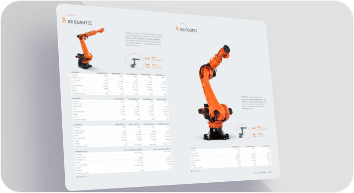�Foundry �Foundry KR QUANTEC KR FORTEC 阀阀 has completely revised the standard version of its bestselling robot, ensuring that it remains state- of-the-art. 阀阀 presents the second generation of the special version for the foundry, forging and machining industries – more digitalized and even better than before. Reach 2,701 – 3,505 mm Payload 120 – 300 kg KR QUANTEC KR 300 R2700-2 F KR 250 R2700-2 F KR 240 R2900-2 F KR 210 R3100-2 F KR 180 R2900-2 F Controller KR C5 KR C5 KR C5 KR C5 KR C5 Number of axes 6 6 6 6 6 Rated payload 300 kg 250 kg 240 kg 210 kg 180 kg Reach 2,701 mm 2,701 mm 2,900 mm 3,100 mm 2,900 mm Pose repeatability ±0.05 mm ±0.05 mm ±0.05 mm ±0.05 mm ±0.05 mm Weight 1,101 kg 1,101 kg 1,120 kg 1,134 kg 1,105 kg Variants F F F F F Installation position Floor Floor Floor Floor Floor KR FORTEC is energy-e昀昀icient and KR QUANTEC KR 210 R2700-2 F KR 150 R3100-2 F KR 150 R2700-2 F KR 120 R3100-2 F dynamic for handling applications in the Controller KR C5 KR C5 KR C5 KR C5 heavy-duty range up to 500 kg. Since it is Number of axes 6 6 6 6 based on our proven industrial robotics Rated payload 210 kg 150 kg 150 kg 120 kg concepts, it requires little maintenance Reach 2,701 mm 3,100 mm 2,701 mm 3,100 mm during operation. Pose repeatability ±0.05 mm ±0.05 mm ±0.05 mm ±0.05 mm Weight 1,077 kg 1,105 kg 1,072 kg 1,105 kg Variants F F F F Installation position Floor Floor Floor Floor KR QUANTEC KR 120 R2700-2 F KR 270 R3100-2 K-F KR 210 R3300-2 K-F KR 180 R3500-2 K-F Controller KR C5 KR C5 KR C5 KR C5 Reach Number of axes 6 6 6 6 2,800 –3,400 mm Rated payload 120 kg 270 kg 210 kg 180 kg Reach 2,701 mm 3,105 mm 3,305 mm 3,505 mm Payload Pose repeatability ±0.05 mm ±0.05 mm ±0.05 mm ±0.05 mm 240 – 500 kg Weight 1,069 kg 1,260 kg 1,266 kg 1,256 kg Variants F F F F Installation position Floor Floor (shelf) Floor (shelf) Floor (shelf) KR QUANTEC nano KR 180 R2100 nano F exclusive KR 120 R2100 nano F exclusive KR FORTEC KR 340 R3400-2 KR 420 R3100-2 KR 500 R2800-2 Controller KR C5, KR C4 KR C5, KR C4 Controller KR C5 KR C5 KR C5 Number of axes 6 6 Number of axes 6 6 6 Rated payload 180 kg 120 kg Rated payload 340 kg 420 kg 500 kg Reach 2,100 mm 2,100 mm Reach 3,400 mm 3,100 mm 2,800 mm Pose repeatability ±0.05 mm ±0.06 mm Pose repeatability ±0.08 mm ±0.08 mm ±0.08 mm Weight approx. 998 kg 963 kg Weight 1,728 kg 1,704 kg 1,671 kg Variants F F Variants HI, F HI, F HI, F Installation position Floor Floor Installation position Floor Floor Floor F Foundry variant F Foundry variant Product portfolio_Foundry 072_073