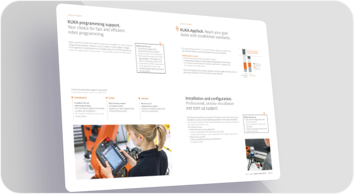 _Setup & Program _Setup & Program 阀阀 programming support. 阀阀.AppTech. Reach your goal Your choice for fast and e昀昀icient faster with established standards. robot programming. Highly qualified and dedicated sta昀昀 will support you throughout the entire program- Added value for you Our option package provides the common thread in application programming Time and cost savings during start-up on site ming and start-up phase. Whether it is just a matter of minor program changes • Experienced programmers with defined interfaces, ready-made program structures and modules. or the application implementation of a complete robot cell: the 阀阀 engineering guarantee fast and competent team is the right partner for your project – in practically every technical discipline. implementation of the application 阀阀.AppTech includes • We know how to apply our techno- • Proven station and component program templates logy packages. This enables us to • A comprehensive library of customizable and expandable function blocks Modification reduce unnecessary project risks • PLC function and data blocks for seamless, optimized PLC programming Optimization • Comprehensive o昀昀line preparation for common PLC manufacturers Start-up Preparation of the application ensures the shortest possible start-up times on With 阀阀.AppTech as the company standard, you save valuable time since the pro- Usual Use of the real system gram logic and operator control concept are always identical. programming 阀阀.AppTech with KRL Choose the appropriate programming support to match your project-specific circumstances Comprehensive Flexible Individual Installation and configuration. Complete cell and Programming support Hand-in-hand Professional, precise installation robot programming via support quotas programming support From the first simulation to the ramp- Support your robot programming Execution of specific project pha- and start-up support. up phase and acceptance – through flexible quotas. ses of your automation. the complete handover for your auto- mation project. We install and assemble your equipment. Through error-free initial start-up and Added value for you installation, we ensure correct operating parameters of the robot components. • Less wear and longer service life This increases durability, avoids unwanted problems when replacing components of your equipment and reduces maintenance costs. • No reteaching after maintenance Our scope of services and repair • Initial robot start-up and configuration • Correct configuration and function – Correct configuration of the load cases, robot check right from the start – Load data determination, correct adjustment of the energy supply system • Robot and KL assembly – Precise installation according to specifications – Acceptance report Product portfolio_Global Customer Services 184_185